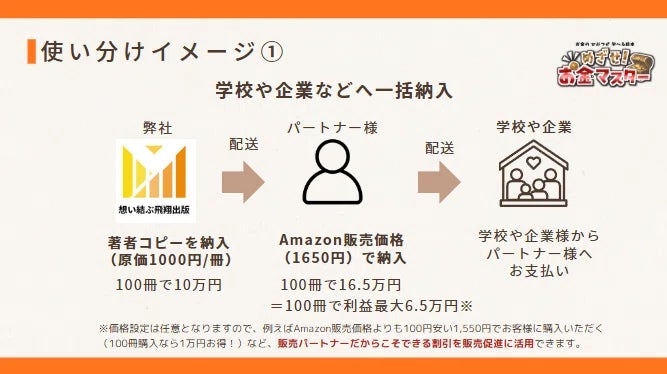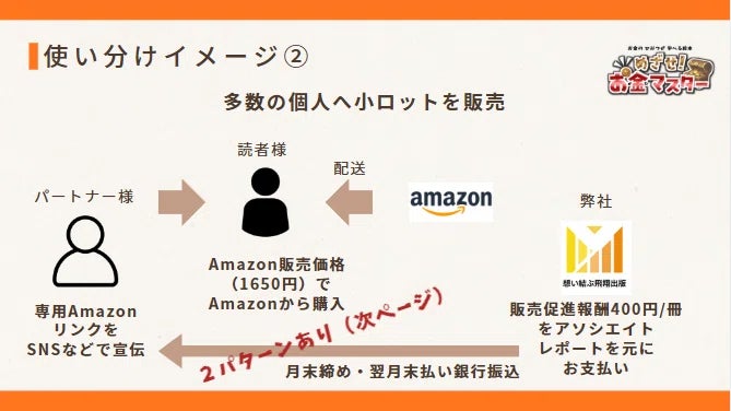 この制度は、絵本シリーズ『めざせ!お金マスター』(全3巻+合本版)のペーパーバックを広めてくださる方々に適正な販売報酬をお支払いする仕組みです。販売方法に応じて、2つのスタイルから選択できます。