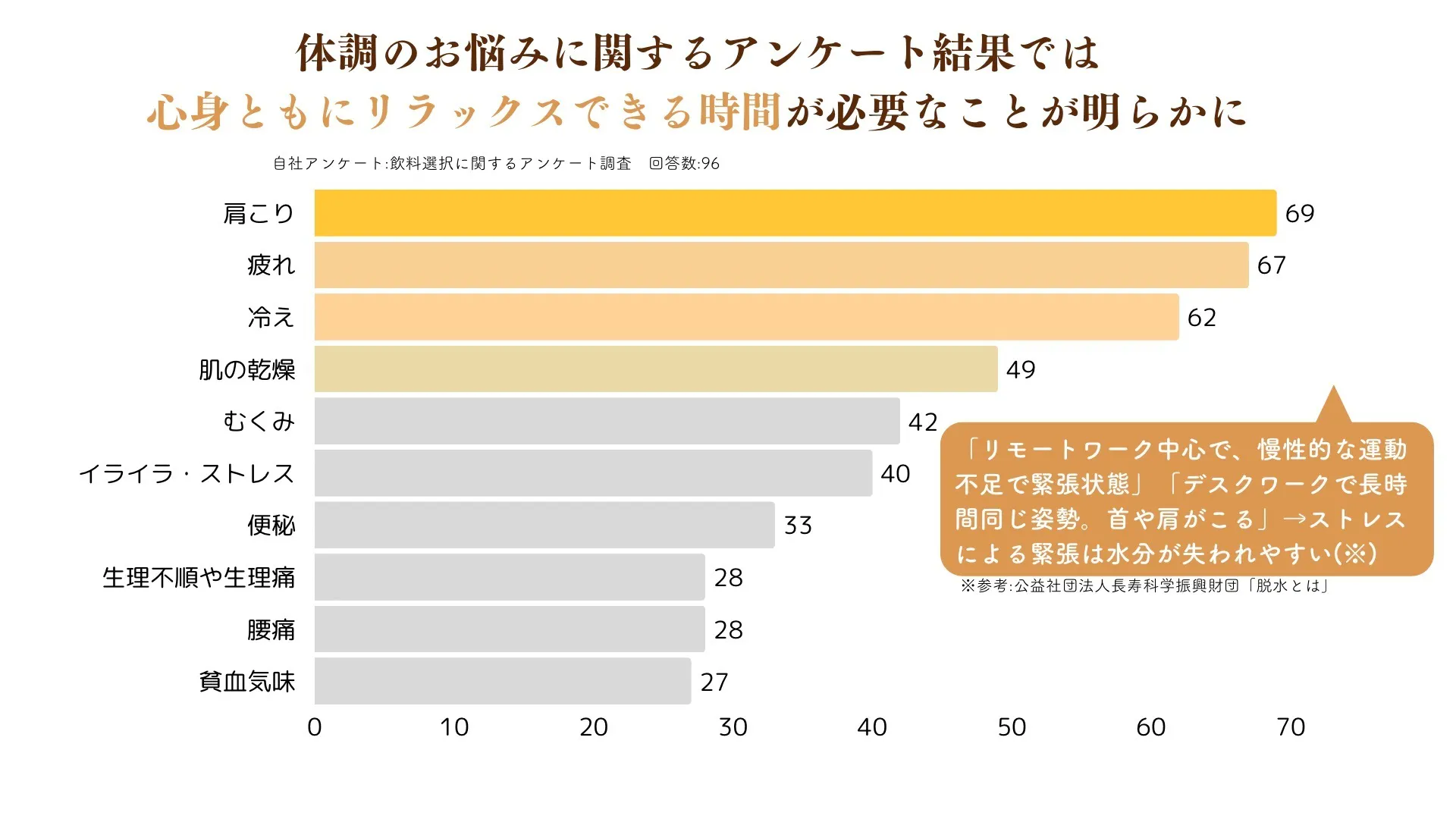 このアンケート結果から、日々の緊張状態をほぐし、リラックスできるドリンクを作りたいと製品化を始めました。
