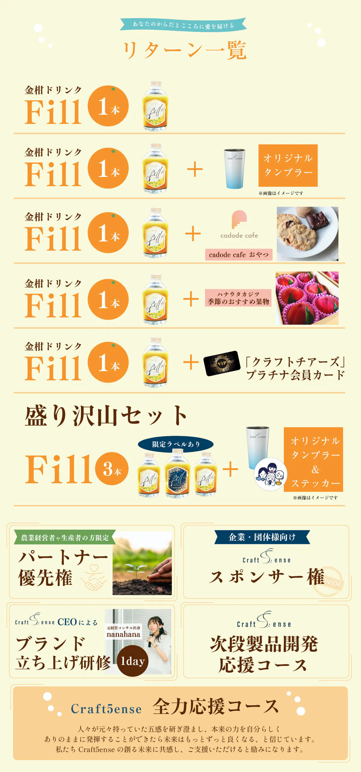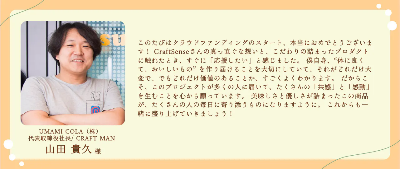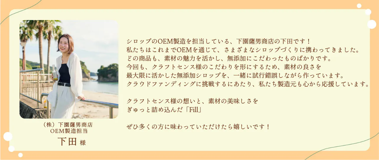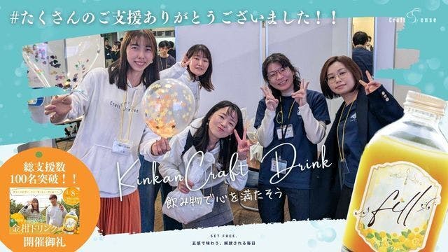 2025/05/25 21:01\心からのありがとうと、新たなはじまりを/Craft5ense初のクラウドファンディング、CAMPFIREにて108名の方にご支援いただき、無事に完走いたしました!そして…最終日にはなんと、CAMPFIREのプロジェクトの閲覧数1位を獲得しました!駆け込みの応援がたくさん届き、まさにみなさんに打ち上げ花火をたくさん上げていただいたようで、ただただ感動いたしました。私たちは、人と人、人と自然が豊かにつながる瞬間を、毎日に取り入れられる選択肢として届けることをコンセプトにブランド運営に踏み出しました。今回縁あって主役になった”金柑”は、太陽をたっぷり浴びて育ち、皮ごとまるごと食べられるほどやさしく、香りも味わいも、どこかほっとする果実です。fillは、そんな金柑の魅力をぎゅっと閉じ込めて、頑張り屋なあなたの心と体に、やさしく寄り添う“ひと息”を届けたいという想いで生まれました。お届けは7月下旬頃を予定しております。普段は冬にしか味わない爽やかな金柑を、ぜひ、夏☀を楽しむための一杯年て楽しみにお待ちください!!これはゴールじゃなく、始まりです。fillを飲むことで、自分を取り戻す瞬間や、自然とつながる感覚を感じてもらえるよう、ここから本気で走っていきます!リターンも、楽しみにお待ちください!!あなたの応援が、私たちの力です。本当に、本当に、ありがとうございました!Craft5ense 一同 もっと見る