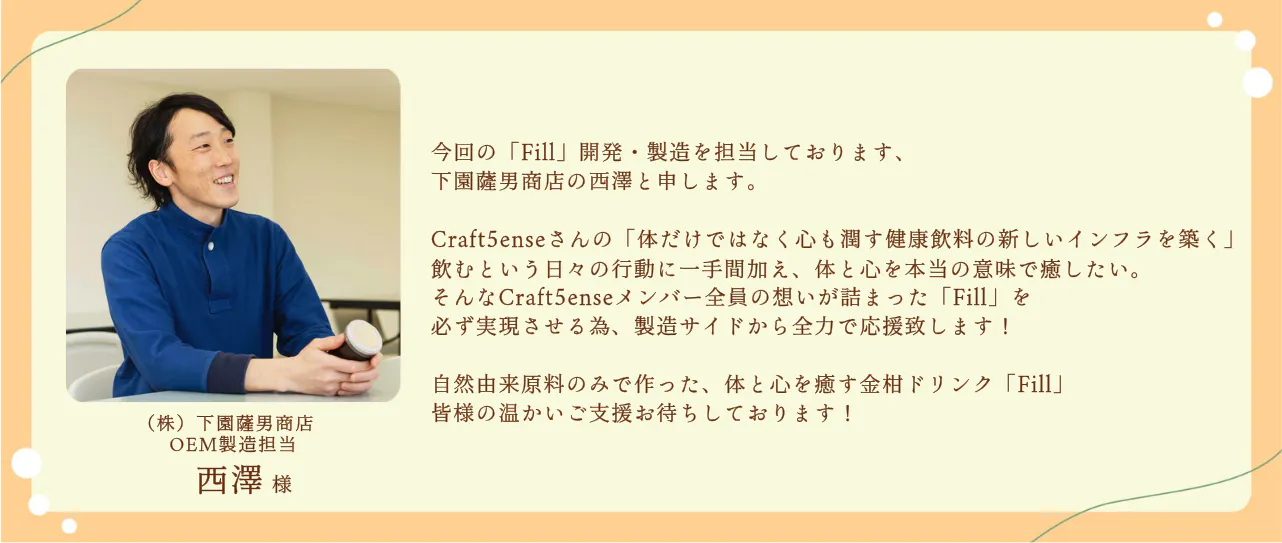 私たちは、ハナウタカジツさんの熱い想いに共鳴し、「素材の力を活かした、心と体に寄り添う一杯」を共に創ることを決意しました。『Fill』は、熊本の果物農家と歩みを始めたばかりのブランドの挑戦が生んだ、特別な金柑ドリンクです!