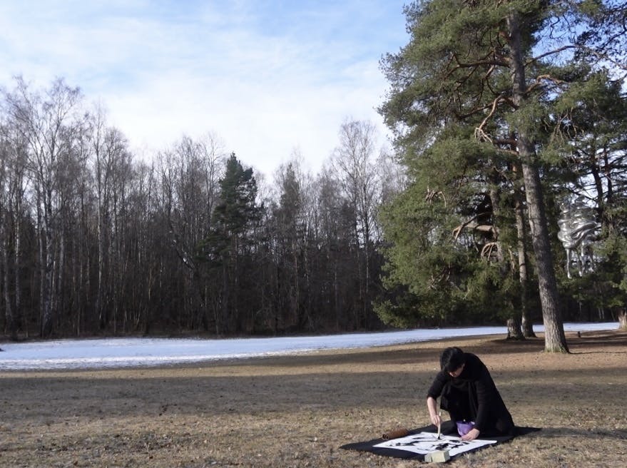 早朝の静寂の中、鳥のさえずりと澄んだ空気に包まれながら筆をとる感覚は、想像以上の心地よさ。自然と一体になり、書を制作する感覚に、すっかり魅了されました。