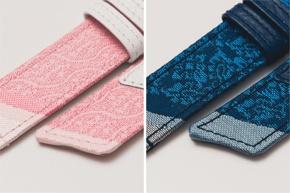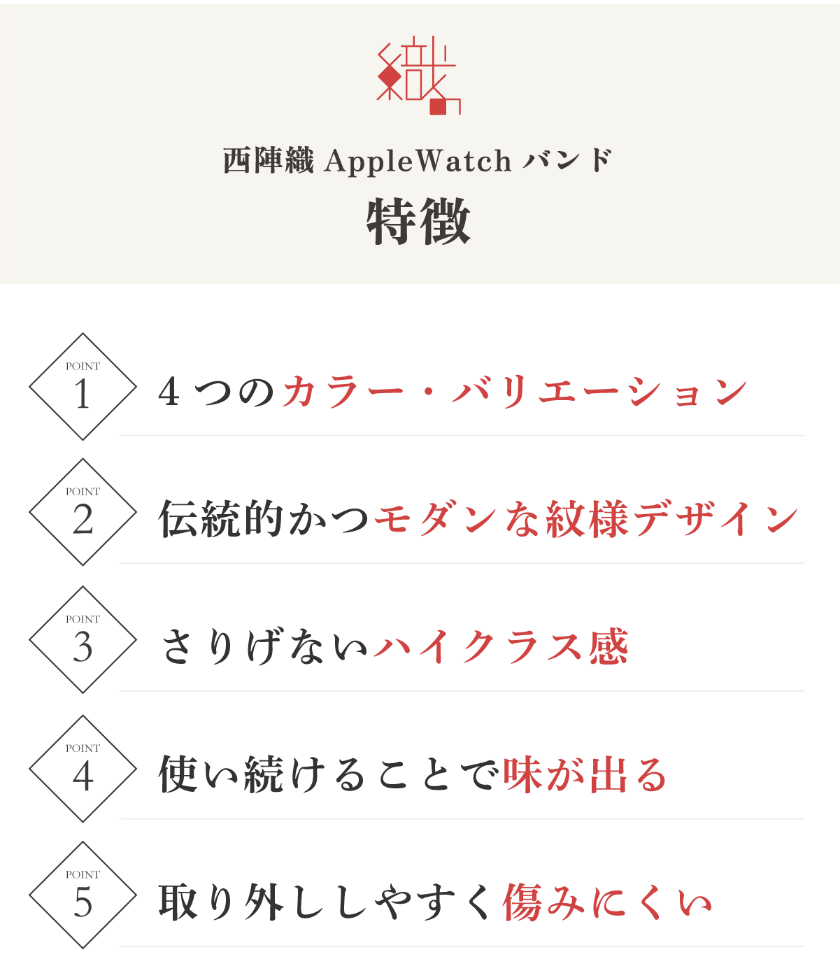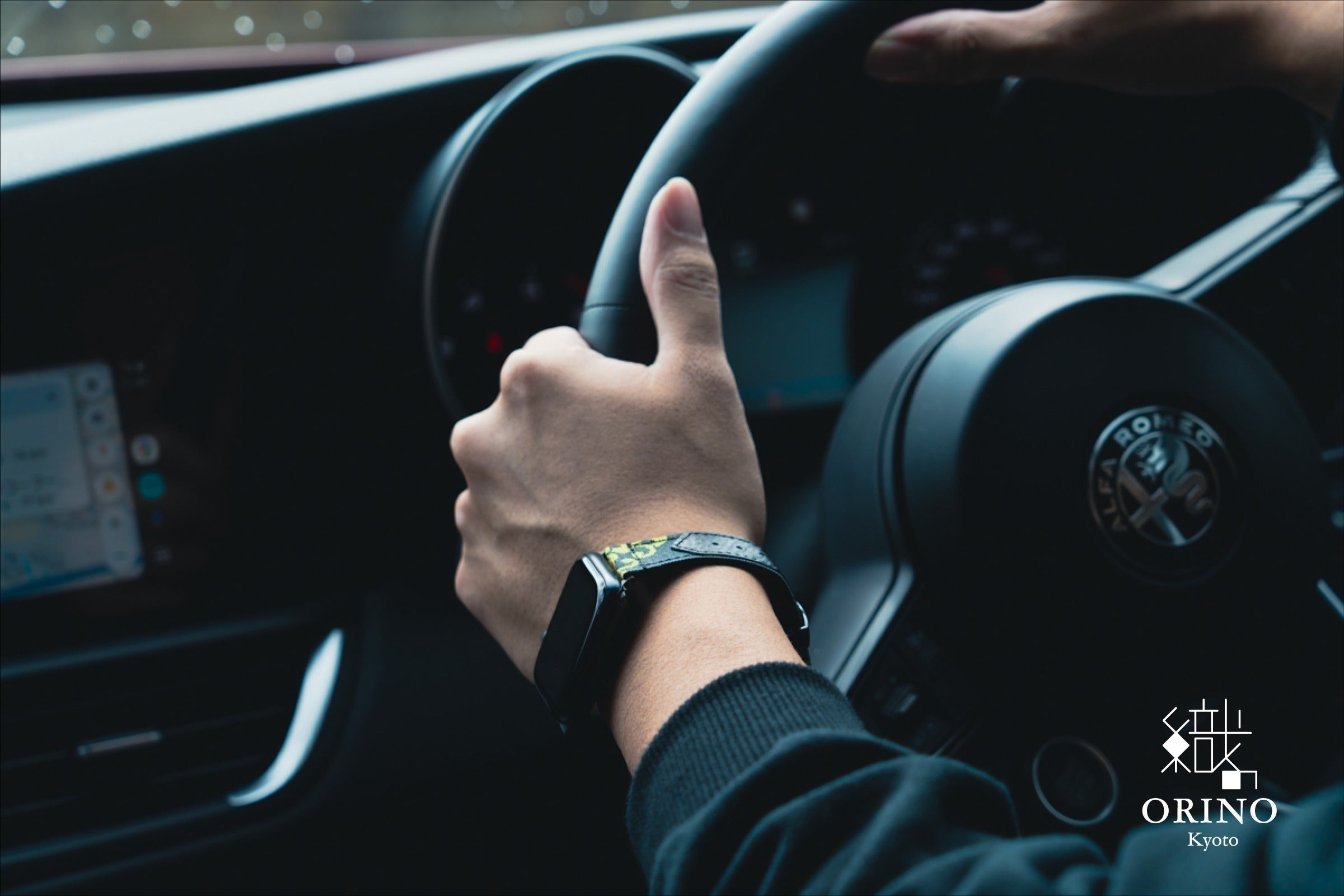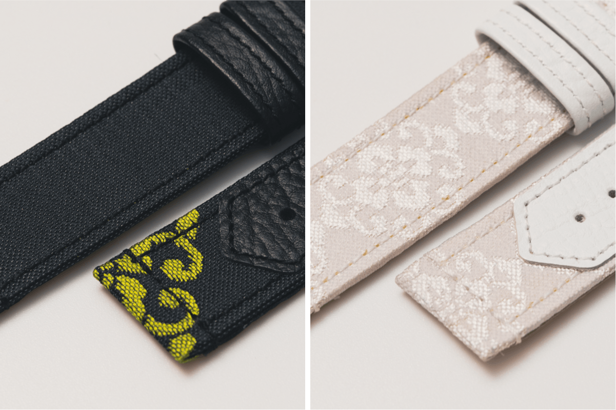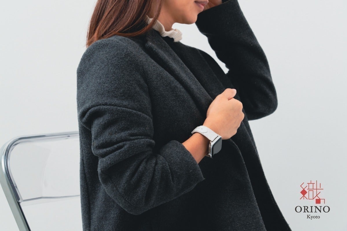 経年変化を楽しむことができるというのも、手仕事のものづくりで生まれたアイテムならではの魅力です。本バンドは西陣織の生地と本革でつくられており、使用していく中で色や質感の変化を味わうことができます。