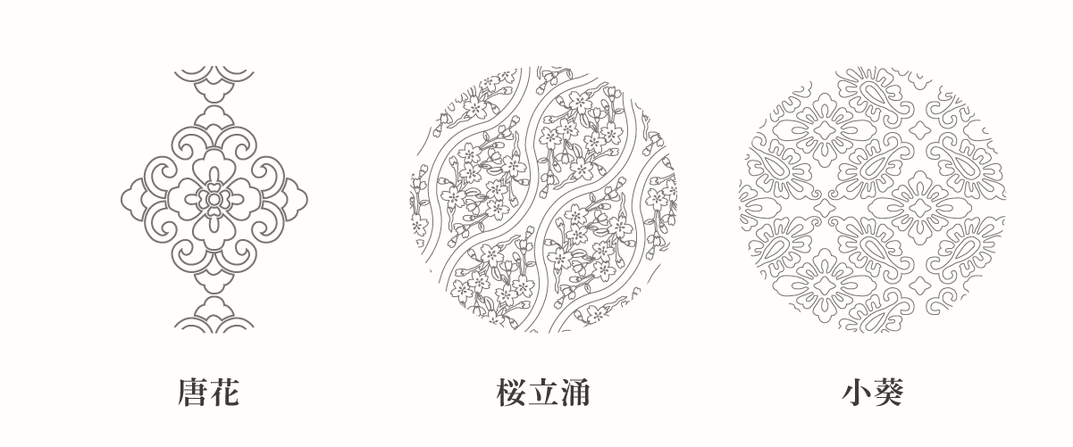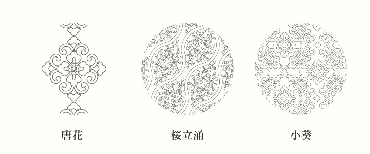 柄には「有職文様」と呼ばれる文様を採用。「有職文様」は平安時代の貴族社会でよく使われたものですが、幾何学的なカタチを基調としておりモダンな印象を与えてくれます。