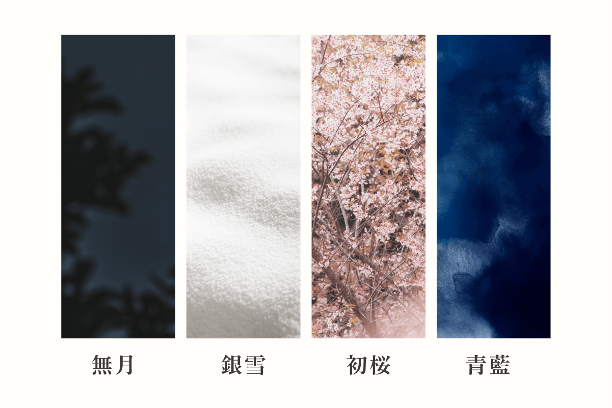 季節や気分で使い分けができるよう、「黒・白・ピンク・藍色」の4つのカラー・バリエーションをつくりました。すべて日本の情景や色を表す言葉から着想を得て、イメージを作成しています。