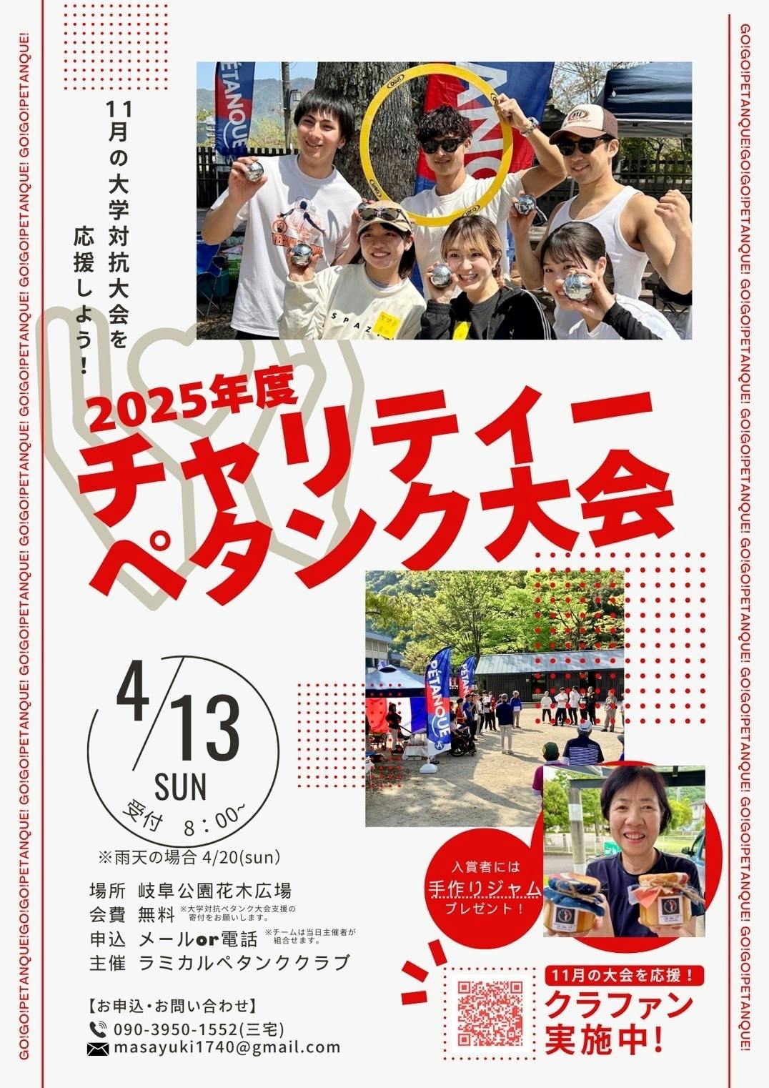 2025年4月13日開催予定のチャリティペタンク大会は、岐阜市の岐阜公園花木広場で開催されます。そして、11月の第三回大会の運営資金の寄付を募り、同時にクラウドファンディングへの協力も呼びかけます。