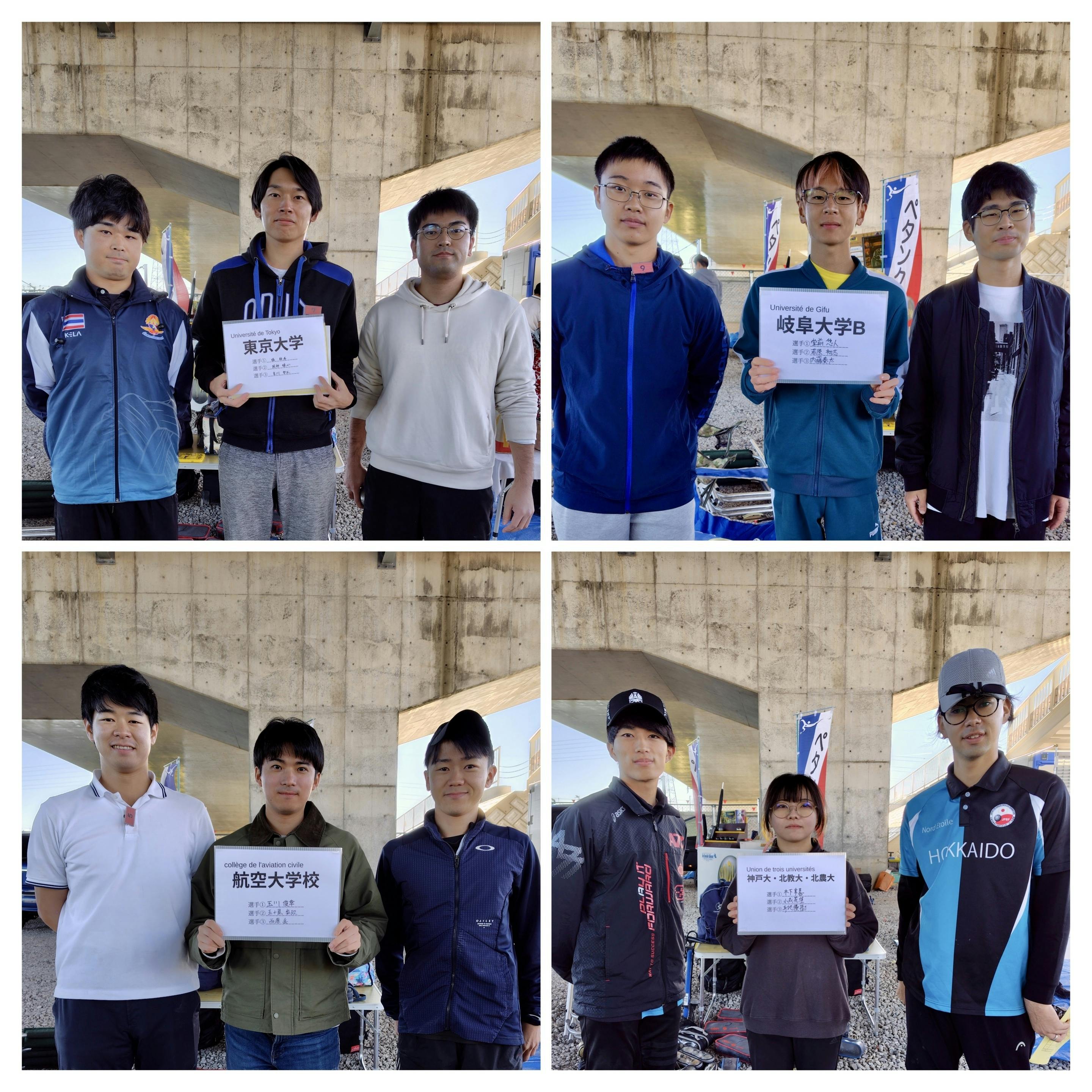 日本学生ペタンク選手権2024年度優勝の北海道農業大学校・北海道教育大学・神戸大学チーム、同2023年度優勝の航空大学校チーム、同2022年度優勝の東京大学チーム、そして、愛知文教大学学長杯2024年度優勝の岐阜大学Bチームです。