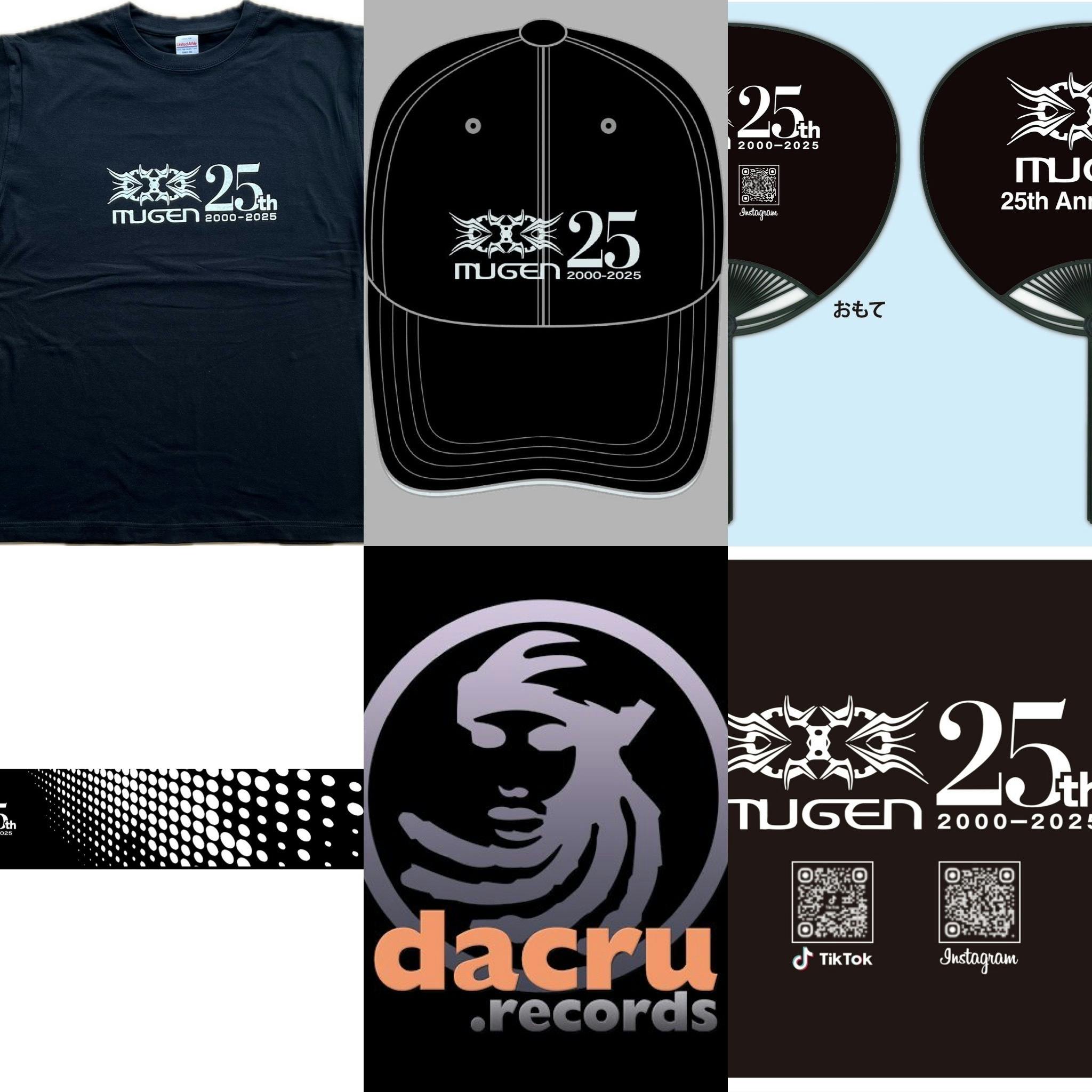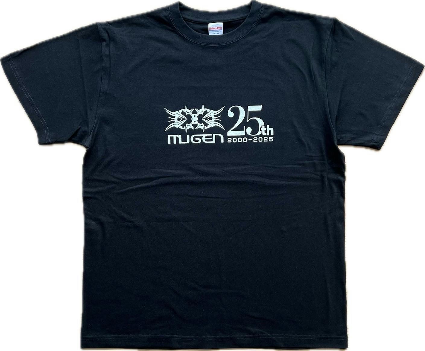 黒地に特別デザインの25周年記念Tシャツ。MUGEN Productionsのアパレルアイテムを担当するデザイナーは20年以上前からずっと同じで、発売する度に即完売する大人気アイテムです。フェス当日はもちろん、カジュアルシーンでも活躍します!25周年現在デザインのステッカー付きです。