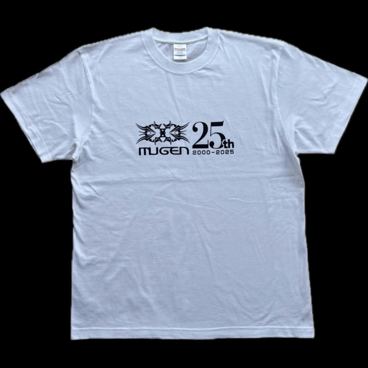 白地バージョンの記念Tシャツ。シンプルでありながらもMUGENのロゴが存在感のあるデザインが特徴です!25周年現在デザインのステッカー付きです。