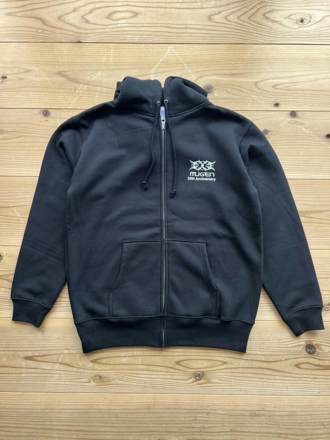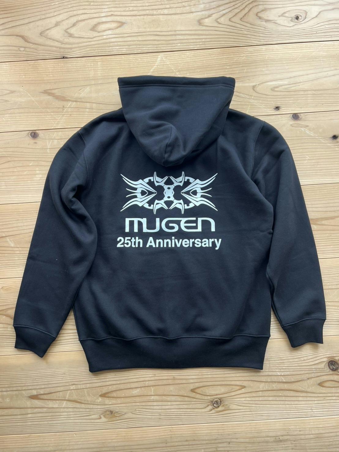 25周年記念パーカー。MUGENのアパレルアイテムは20年以上前からずっと同じデザイナーが担当しています。パーカーは発売の度に即完売する大人気アイテムです。細部までこだわったデザインで、スタイリッシュかつ着心地も良い1着。特別ステッカー付きです。