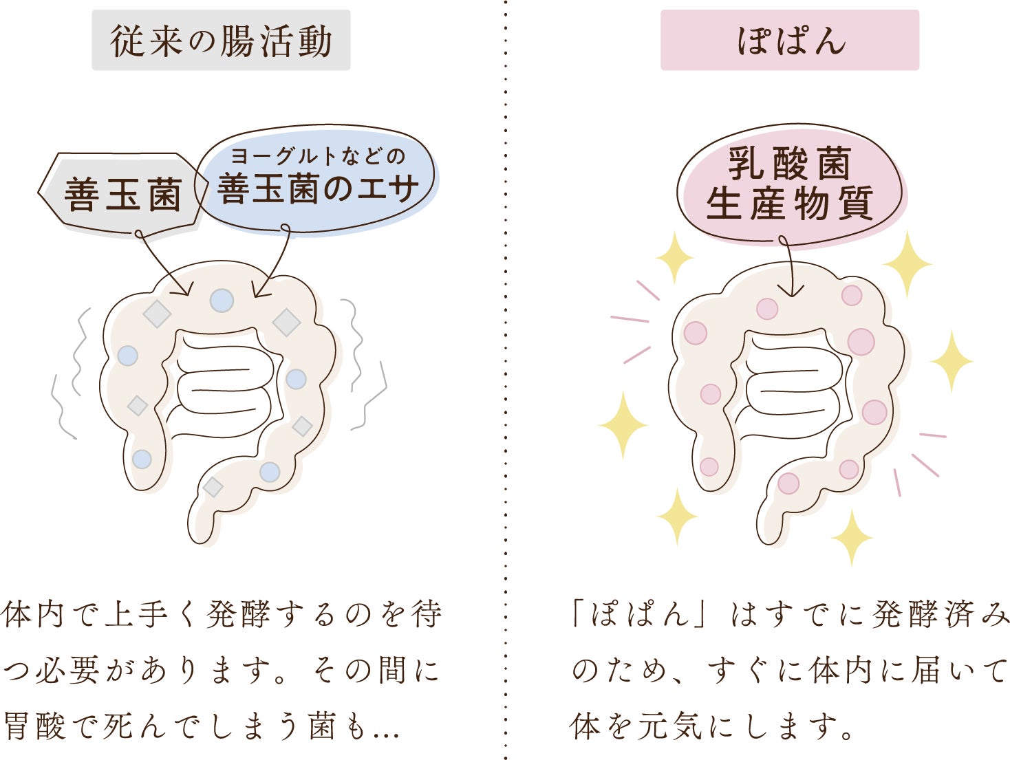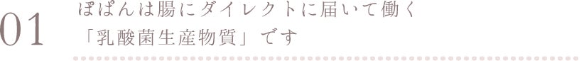 『ぽぱん』は、乳酸菌が生み出す「乳酸菌生産物質」に注目し、これを活かしたドリンクです。乳酸菌そのものではなく、乳酸菌が作り出す生産物質が、胃酸に強く腸にダイレクトに届き、腸内環境を整えるサポートをしてくれます。