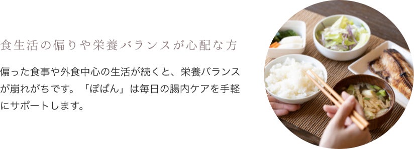 現代社会では、腸内環境が乱れる要因が数多く存在します。毎日の食生活やストレス、運動不足、そして加齢によっても腸内環境が乱れることがわかっています。だからこそ、皆様に『ぽぱん』を試していただきたいと考えています。
