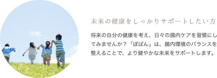 腸内細菌に関する研究は日々進歩していますが、私たちの腸内環境が健康の鍵であることに変わりはありません。ぽぱんを通じて、皆さんの未来の健康を守りたい。そして、この想いが次の世代にまで広がり、腸内ケアが当たり前の習慣になることを目指しています。