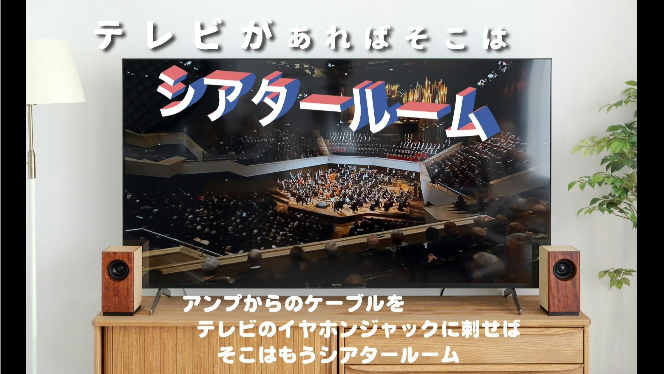 もう特別な装置は必要ありません。テレビのイヤホンジャックにア ンプからのケーブルを挿せば、そこはもうホームシアターです。特 別なもん入りません。