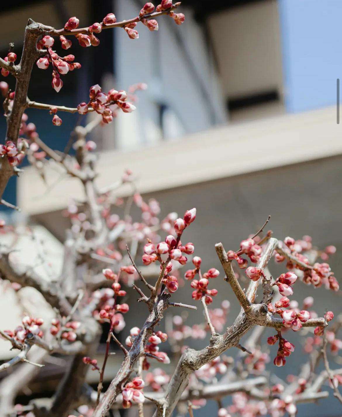 大きな窓から入る心地よい日やお庭にある咲き始めた梅の花。