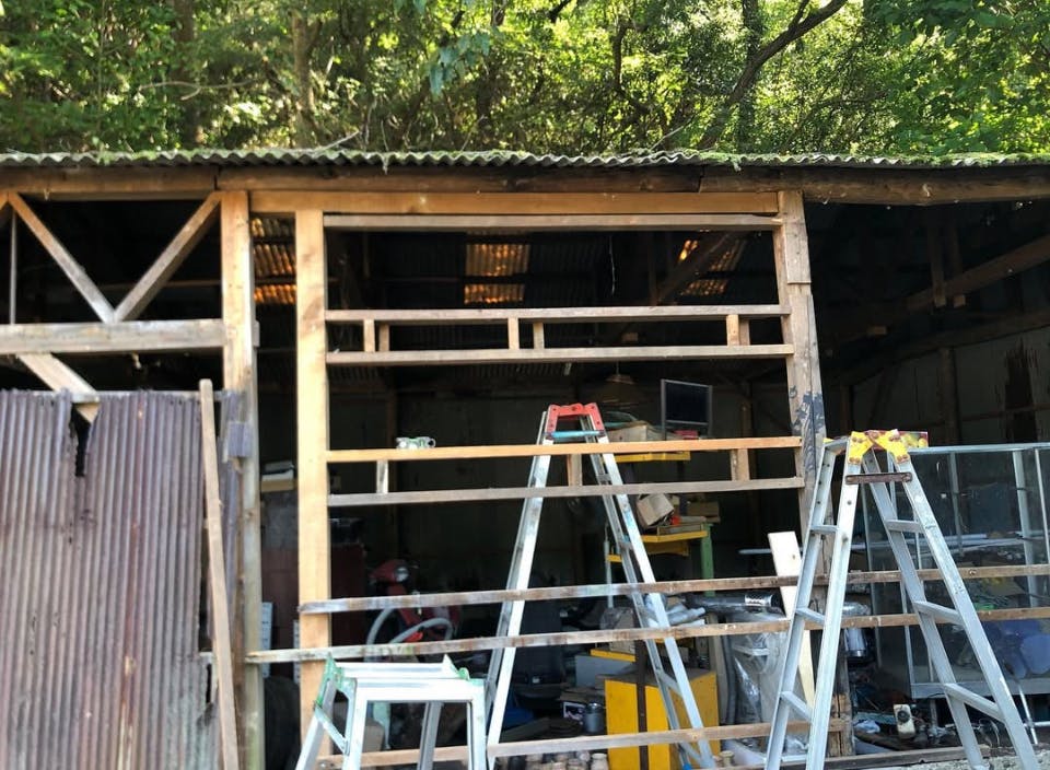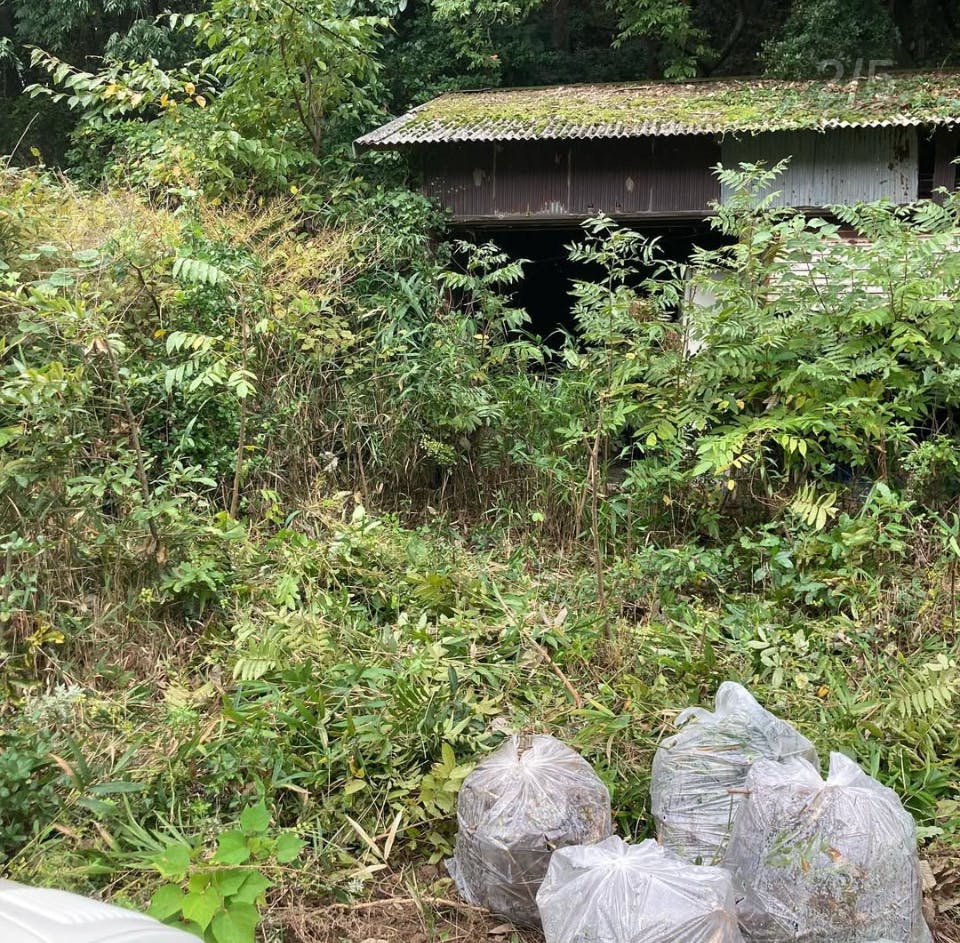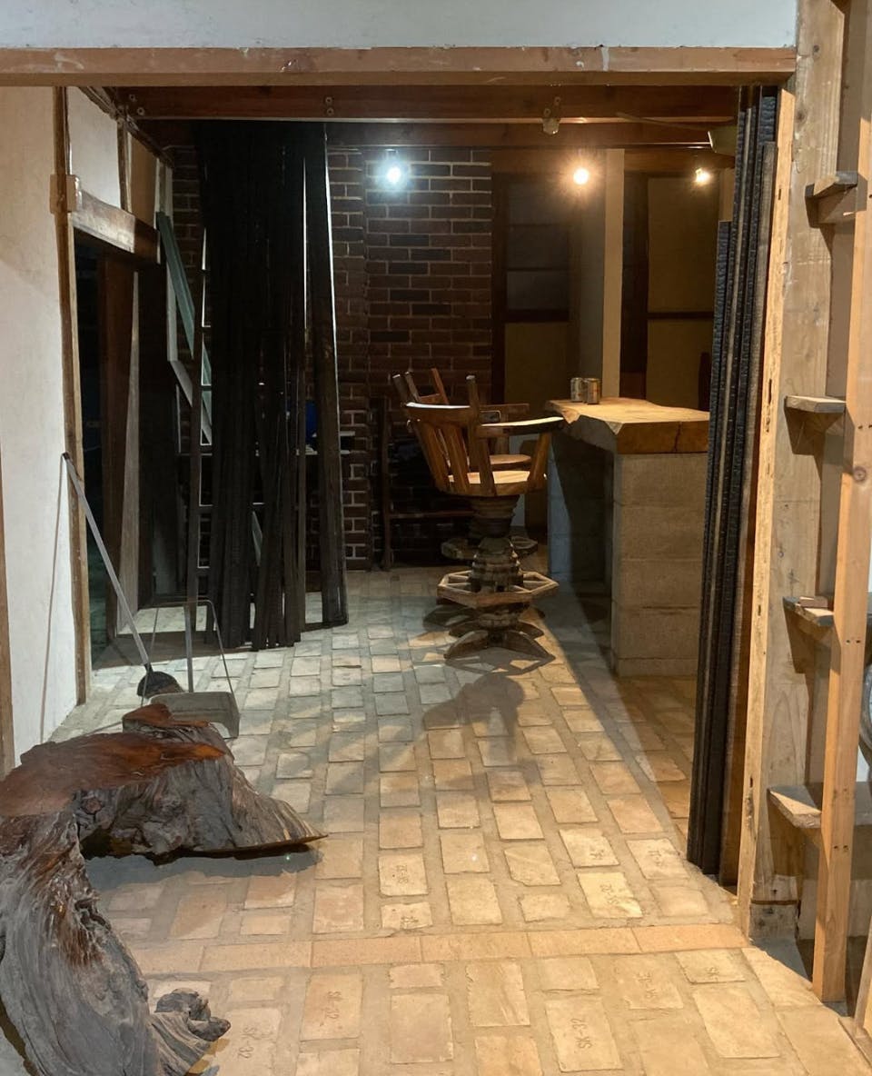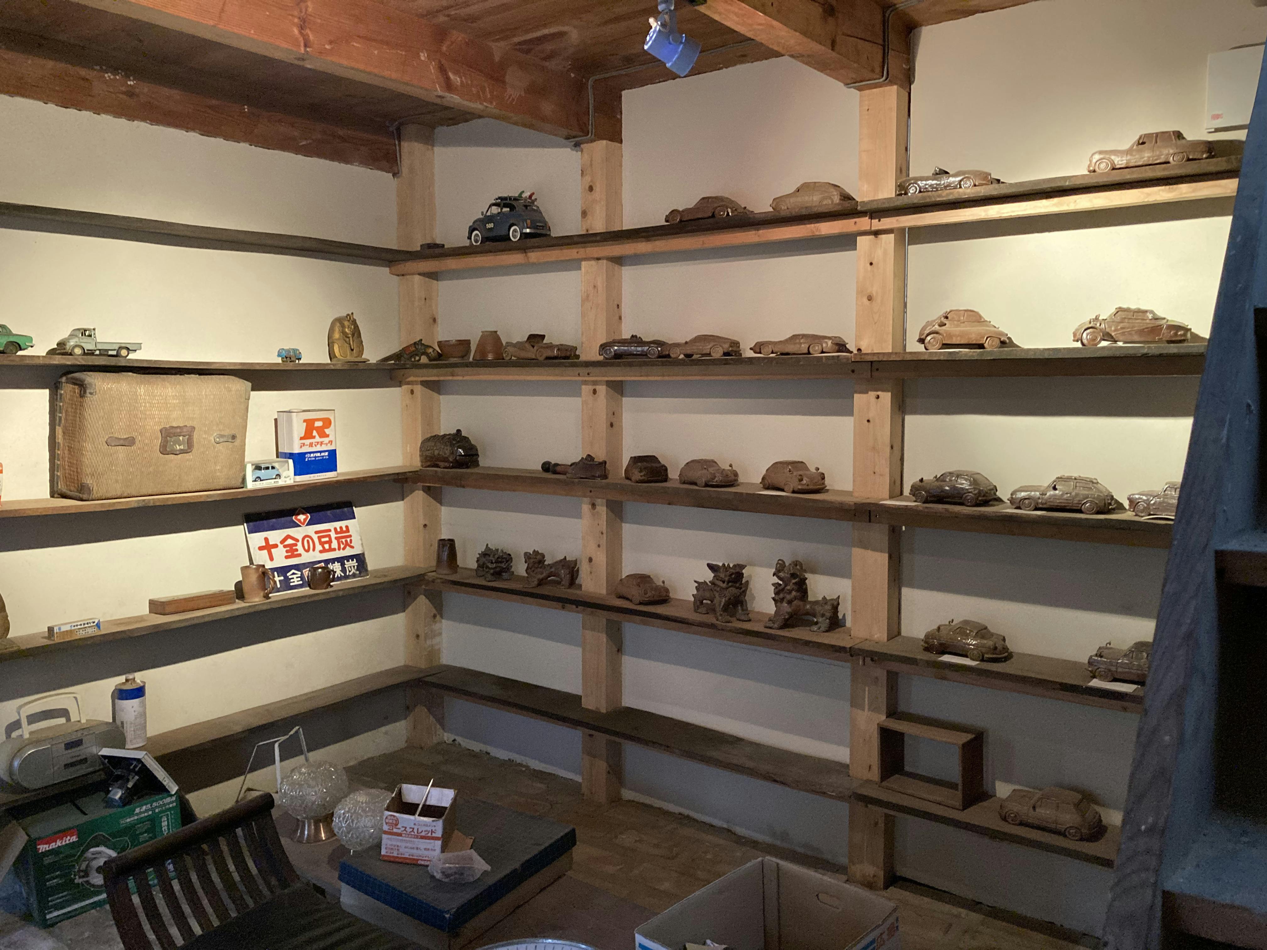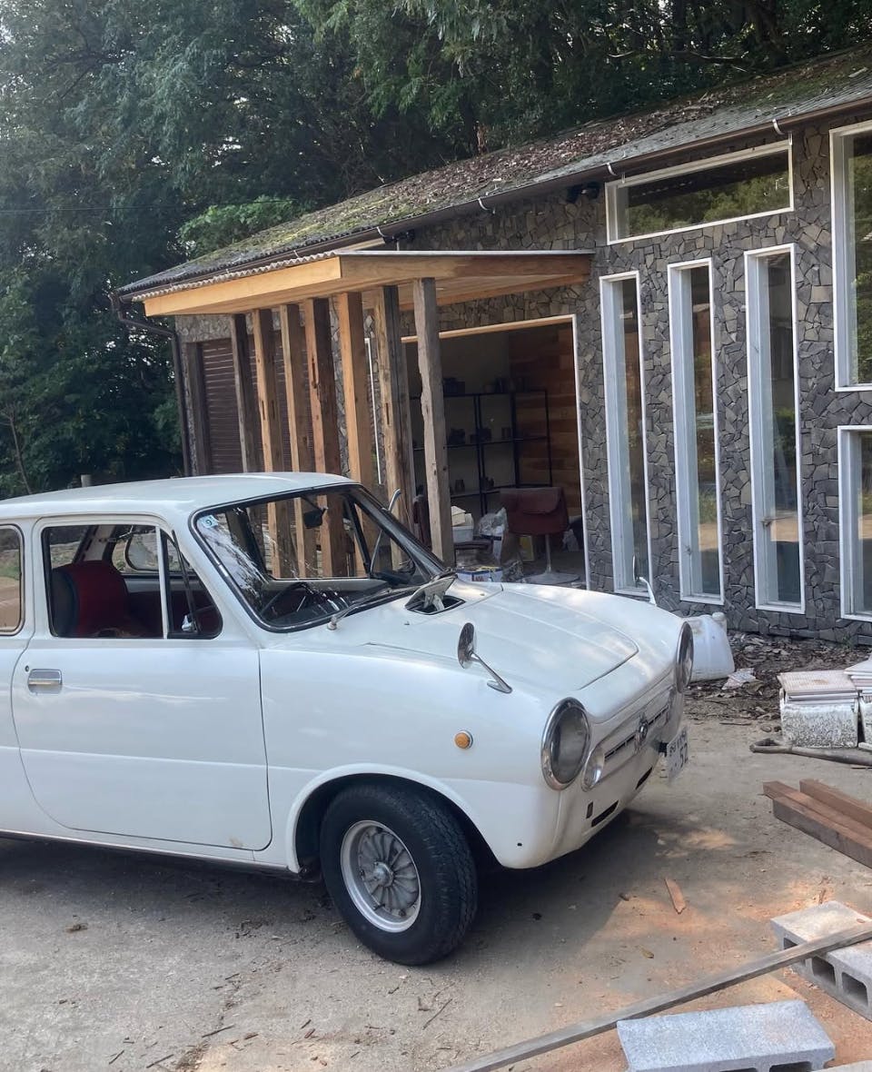 2年ぐらい過ぎた2022年夏、宿泊場所はほとんど完成、隣の倉庫もある程度終わりかけた頃、「更なる車置き場として、倉庫があるのですが、もらってくれませんか?」と手紙が届きました。 持ち主は車庫や母屋と同じ方なのですが、倉庫は周りの竹や木や草などで見えないぐらい森の中でした。でも、車が入れるので、いただくことにしましたが、廃棄物の量が半端なかったです。何にも目的なく、とりあえず、外をきれいにして、物を片付けて、雨漏りや柱が腐って屋根が下がっているところまで直そうかと。 途中でシャッターが全部落ちてしまったので、そこを旧車乗りが集まれる場所(シモツイベース別館)に作り替えようと考えはじめました。わたしは備前焼で旧車作ったりしていたので、旧車にまつわるアート作品を販売するアートギャラリーにしたいなあと。