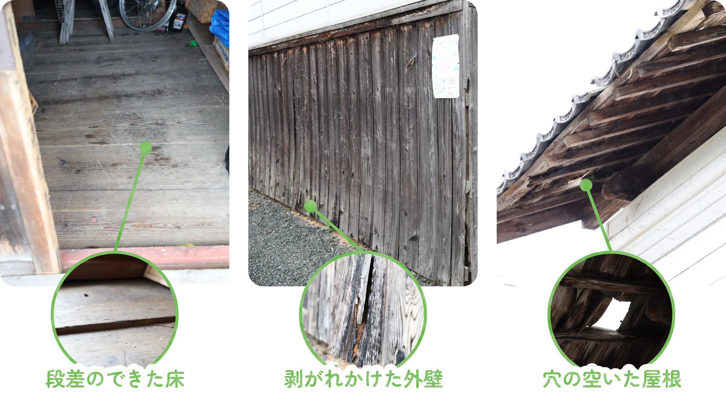 床板は段差ができ、歩くと今にも割れてしまいそうになっています。外壁も長年の雨風にさらされて痛みが激しくなっています。屋根は瓦が割れて穴が空いています。