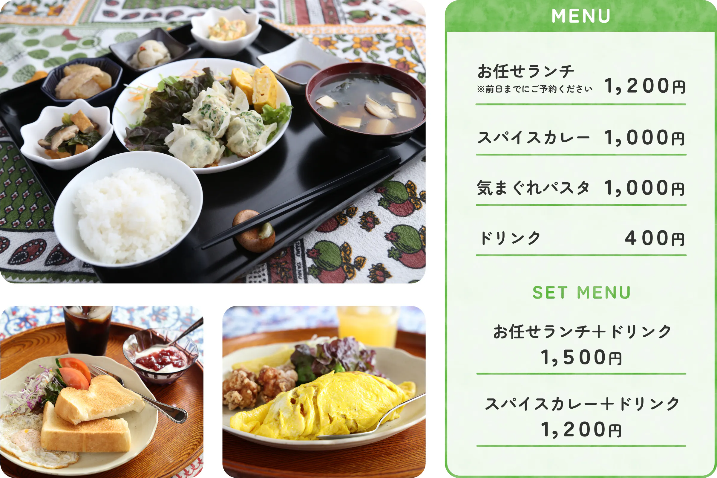 カフェでは、コーヒー、紅茶、自家製シロップジュースの提供しています。季節の野菜を使用したお任せランチ、20種類のスパイスをブレンドしたスパイスカレー、気まぐれパスタなど老若男女楽しめるメニューを準備しています。