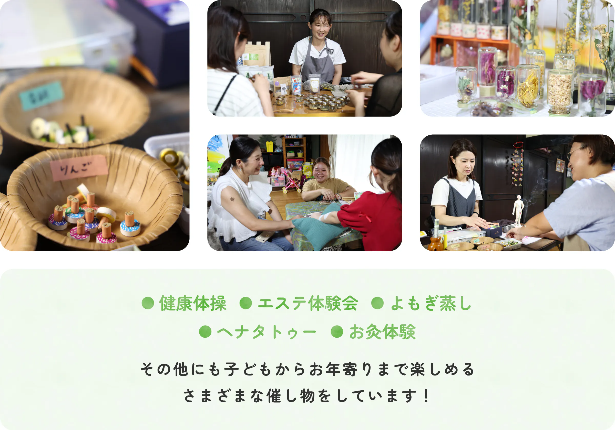 よもぎ蒸しや体操教室、己書幸座や各種ワークショップなどご利用いただいています。