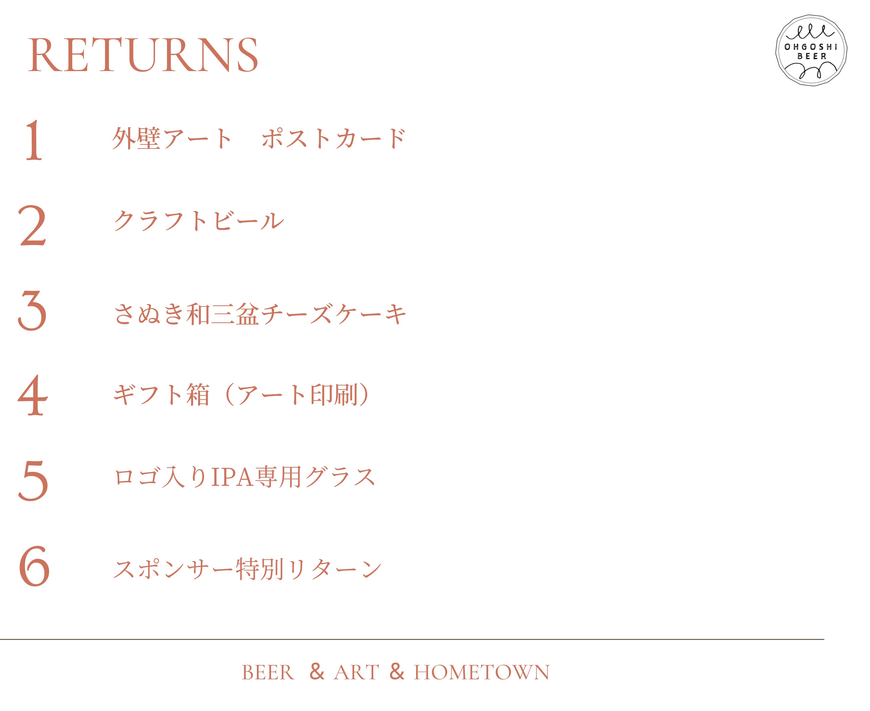 以上の紹介したすべての商品をお届けするだけでなく、「スポンサー様オリジナルラベルビール」、「外壁アート原画」、「新作提供権」の3種類のリターンもご用意しています。さらに、王越麦酒の歴史の一部として、醸造所の外壁にスポンサー様のお名前を刻むことで、私たちの感謝の気持ちを形にいたします。王越麦酒の未来を共に築いていただく証として、永遠に残る特別な記念となります。