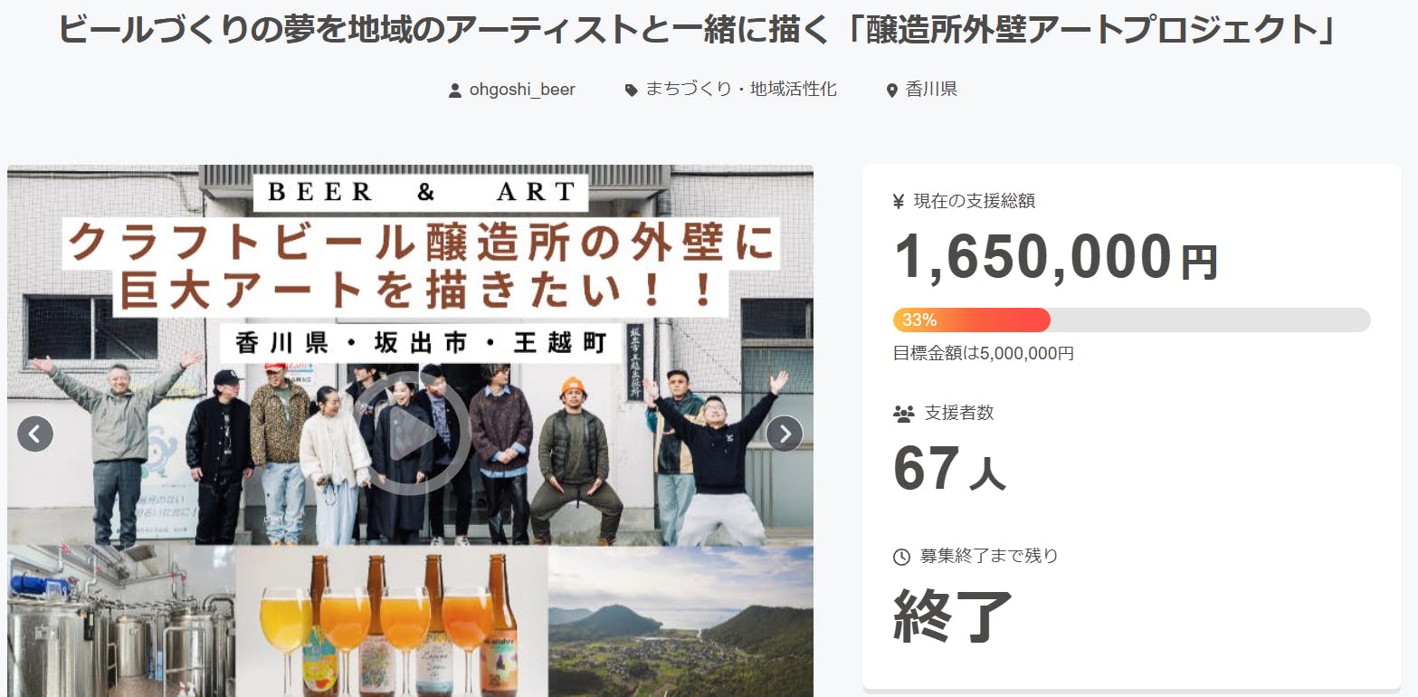 2025/06/05 19:38ご支援いただいた皆さまへ この度は、「王越麦酒 外壁アートプロジェクト」に温かいご支援をいただき、本当にありがとうございました。私たちが心から描いてきた「地域の風景に、アートと人がつながる場所をつくる」という夢は、皆さまの応援によって確かに一歩を踏み出すことができました。たった一つのクラフトビール醸造所から生まれた小さな願いが、67名もの方々に届き、合計1,650,000円ものご支援をいただけたことは、言葉では言い尽くせないほどの喜びと感謝にあふれています。我々のプロジェクトは、ただ壁に絵を描くだけではありません。この場所に暮らす人々と、訪れる人々と、そしてここでつくられるビールが、少しでも温かなつながりを生むように。その想いを込めて、地元アーティストの皆さんと共に、構想を練り、下絵を描き、準備を進めています。地域の子どもたちが足を止め、大人たちが語らい、誰かの心に残る「風景」になることを願っております。これからは、ご支援いただいた皆さまへのリターン品についても、ひとつひとつ丁寧に準備を進めております。ポストカード・感謝のお手紙:7月下旬より発送クラフトビールセット:7月中〜下旬に順次お届け予定オリジナルビールラベル・限定原画・ネームプレートなど:アート完成後、詳細ご連絡いたしますもしご住所の変更などがありましたら、お手数ですがご連絡いただければ幸いです。最後にこのような小さい挑戦に、こんなにもたくさんの「応援」が寄せられたこと。この経験は、私たちにとって一生の宝物です。皆さま一人ひとりのご支援が、この坂出の海沿いに小さな希望の色を重ねてくれました。完成の日を迎えたとき、きっと「あの時、応援してよかった」と思っていただけるよう、アーテイストさん一同、誠心誠意取り組んでまいります。どうか、これからも温かく見守っていただけますと幸いです。本当にありがとうございました。 もっと見る