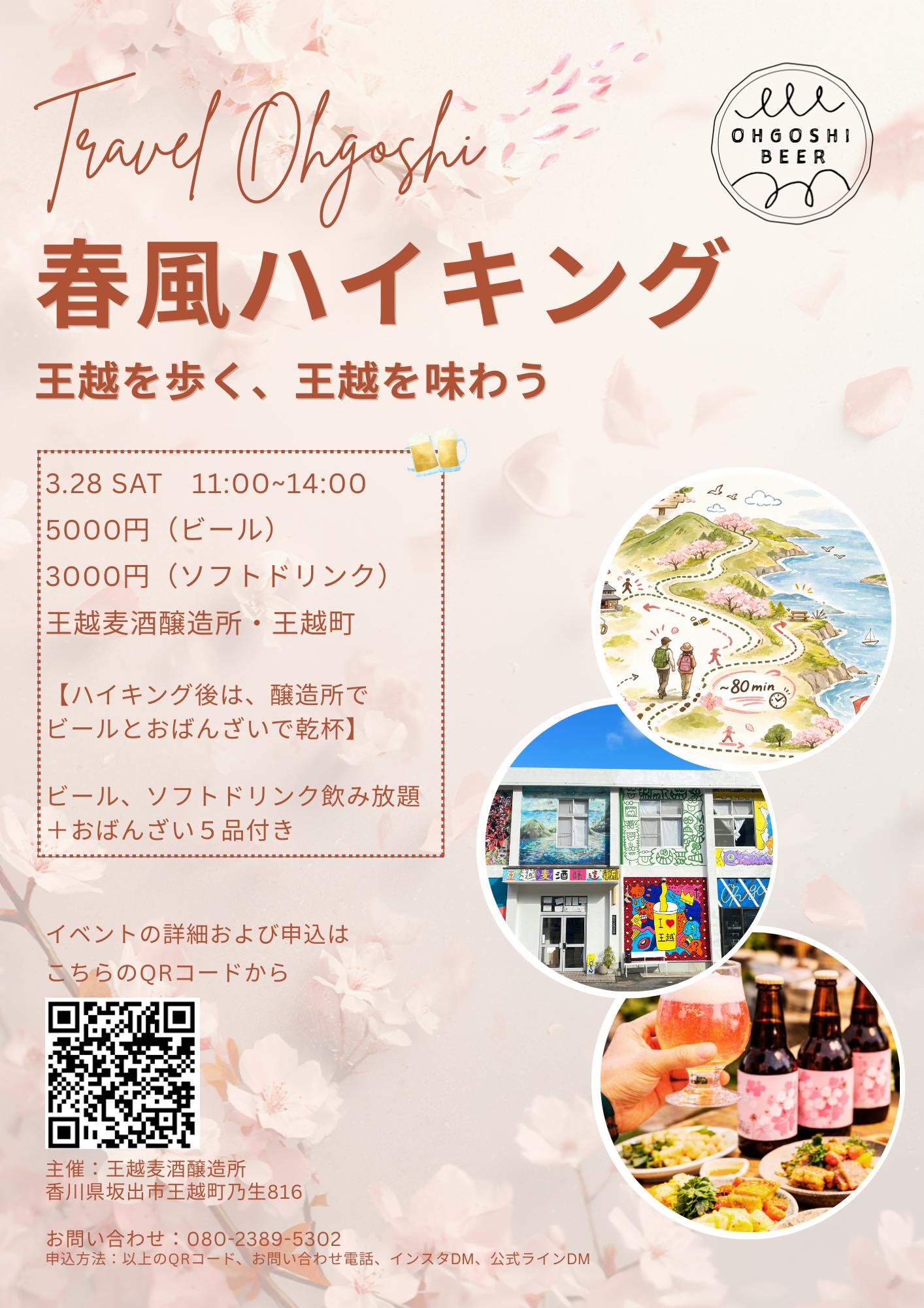 【イベント概要】桜咲く王越を歩き、春の空気を感じるお花見ハイキング。約90分のハイキングとクラフトビール体験を組み合わせた少人数イベントです。ハイキング後は王越麦酒2階にて、ビール飲み放題とおばんざいで乾杯また、スタンプラリーで特別なプレゼントも当たります!!