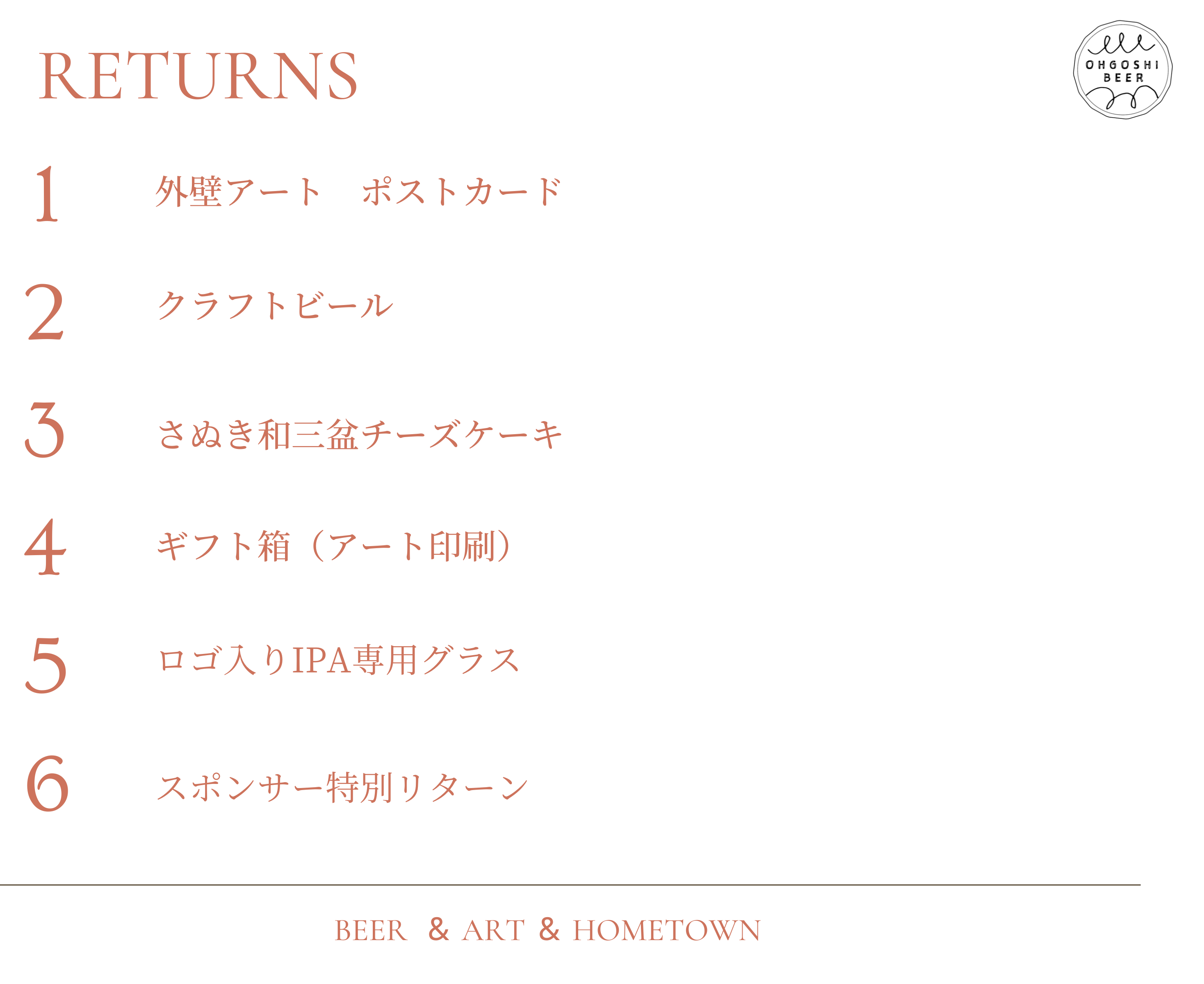 以上の紹介したすべての商品をお届けするだけでなく、「スポンサー様オリジナルラベルビール」、「外壁アート原画」、「新作提供権」の3種類のリターンもご用意しています。さらに、王越麦酒の歴史の一部として、醸造所の外壁にスポンサー様のお名前を刻むことで、私たちの感謝の気持ちを形にいたします。王越麦酒の未来を共に築いていただく証として、永遠に残る特別な記念となります。