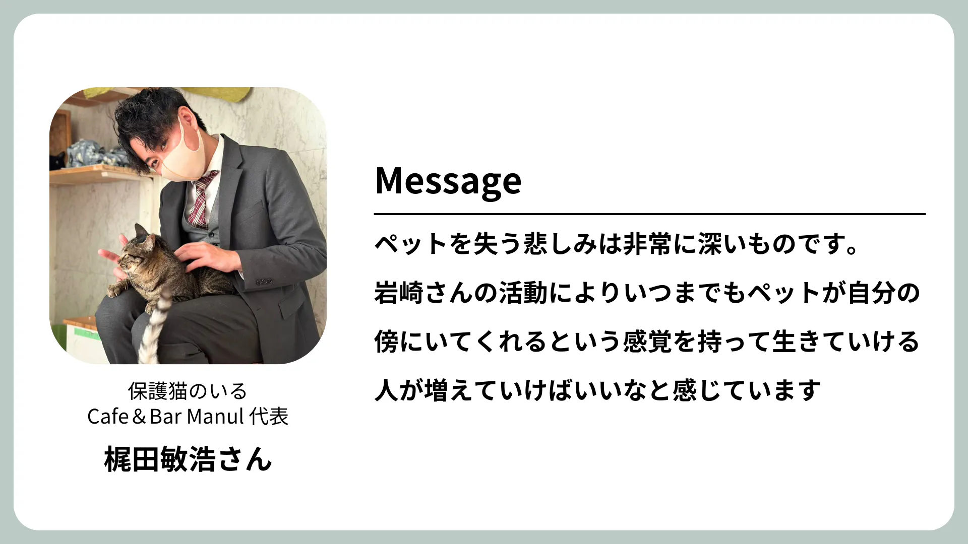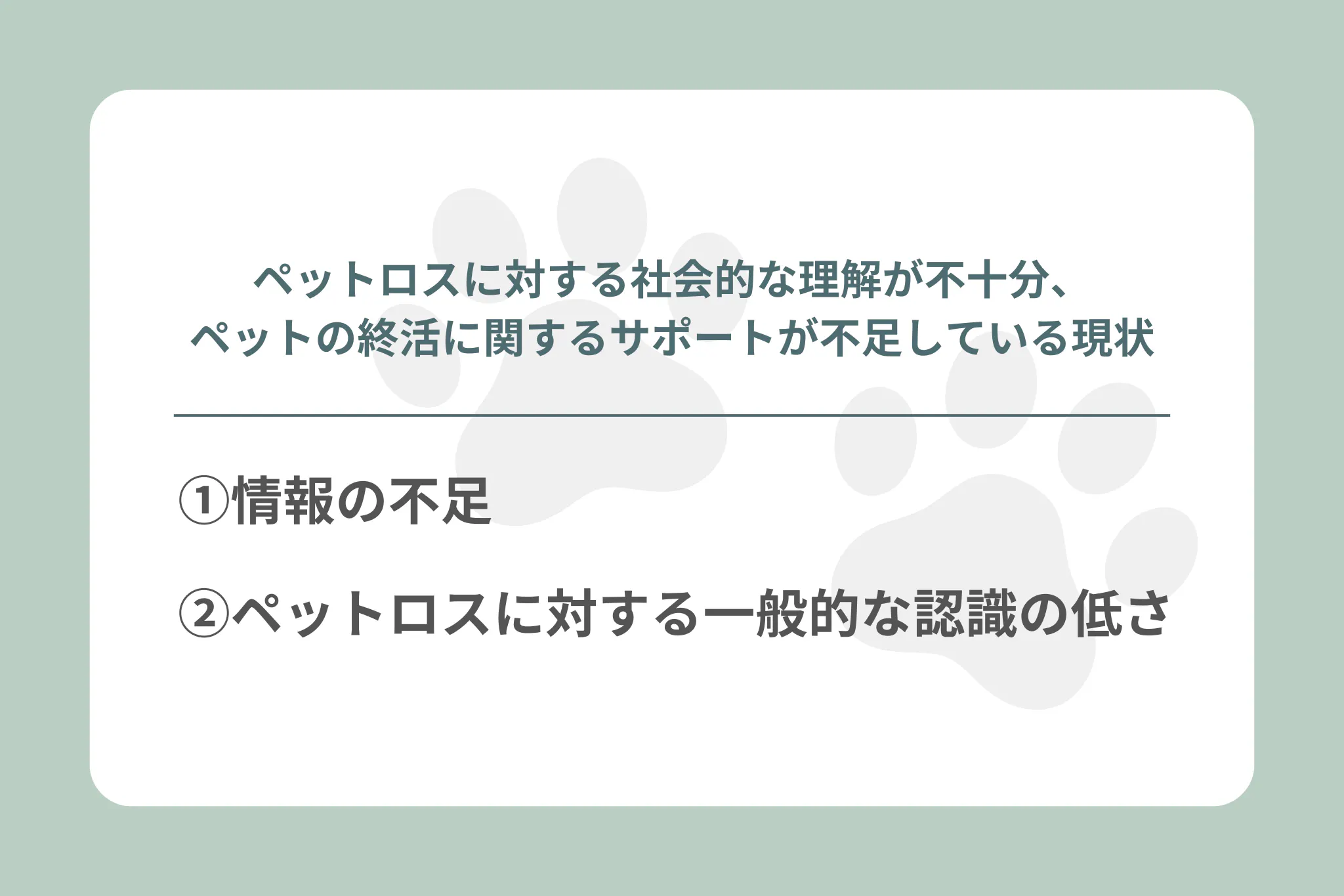 また、ペットロスに対する社会的な理解がまだ十分でないこと、そしてペットの終活に関するサポートが不足している現状を目の当たりにしたことも、ペットロスの課題を解決するに至った背景にございます。