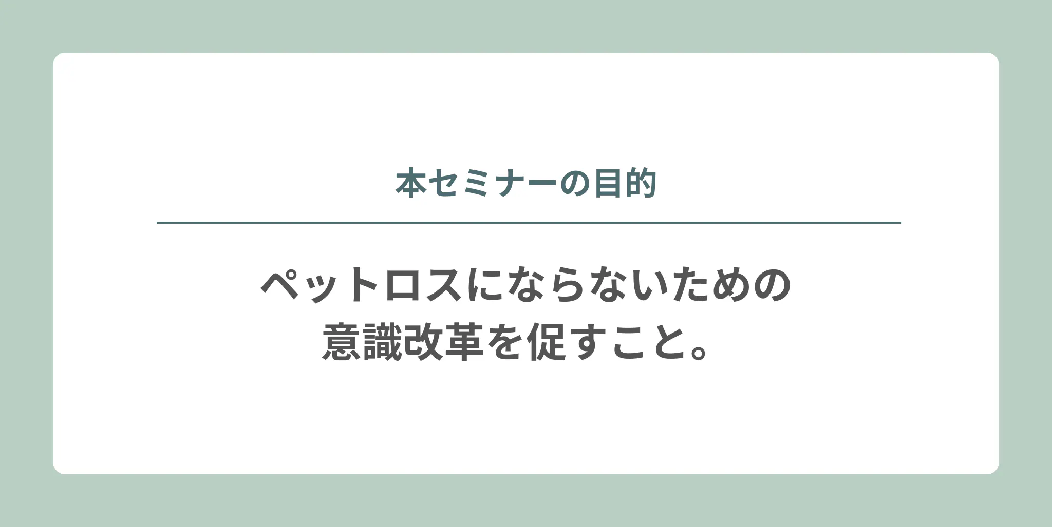 具体的には以下の目的とテーマでセミナーを行い、ペットロスを未然に防げるようにサポートいたします。
