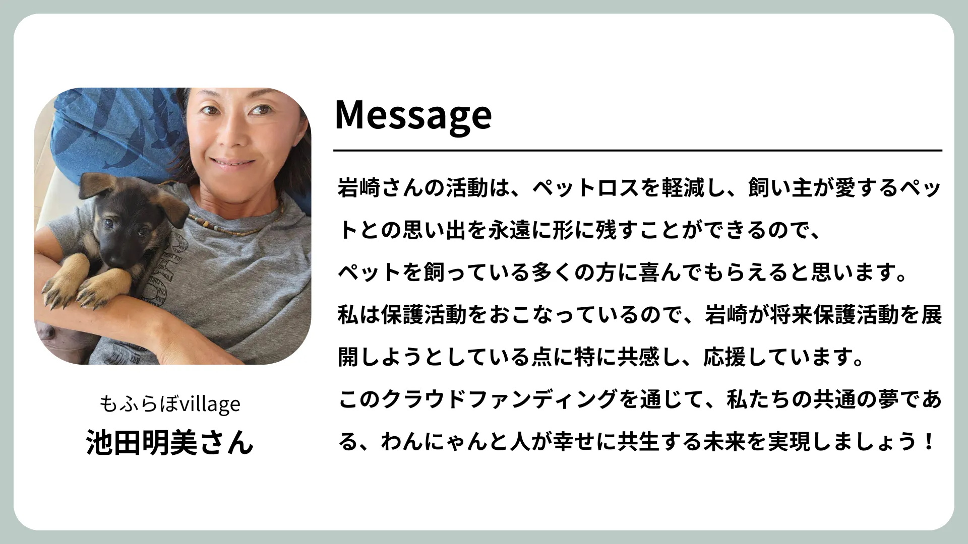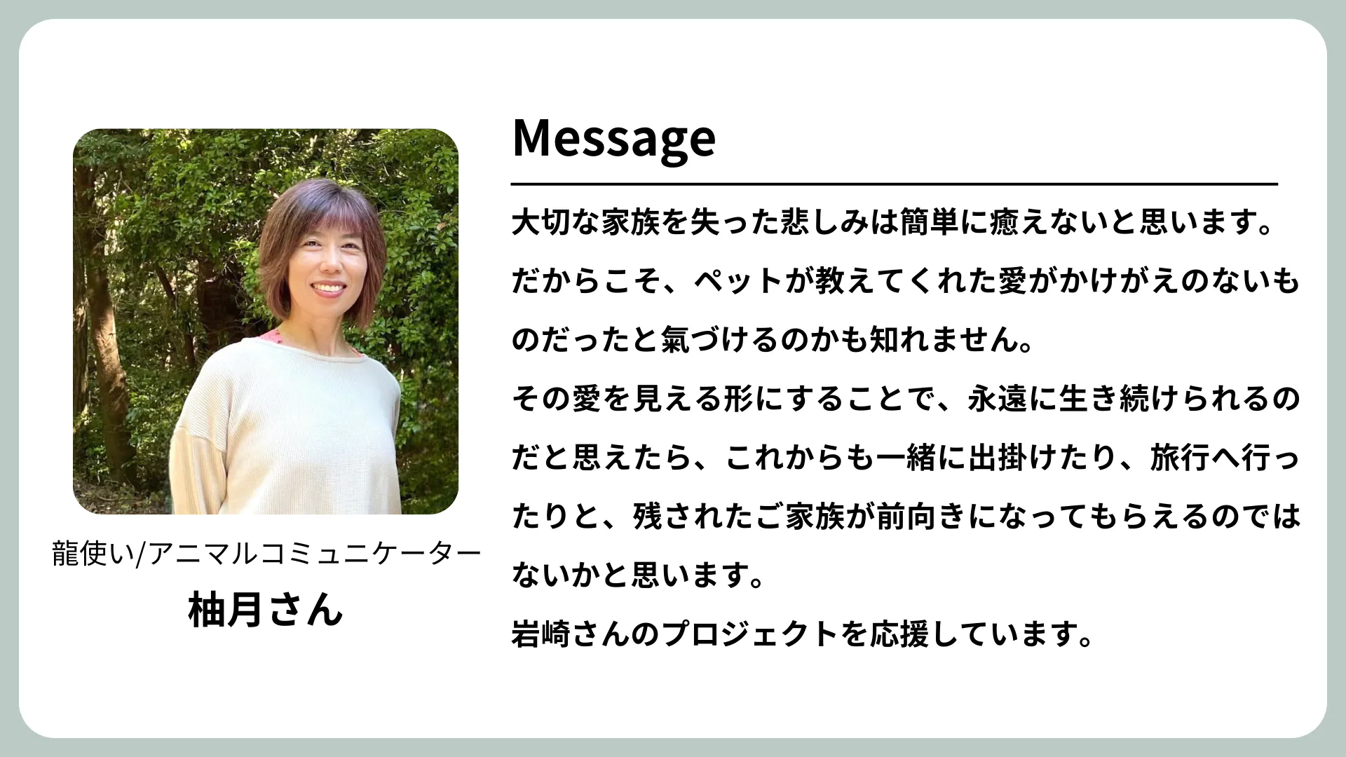 本プロジェクトを通じて、1人でも多くの方々にペットロスについて理解を深めていただくことと同時に、私たちの活動にご賛同くださる方は、ご支援とご声援をいただけますと幸いです。