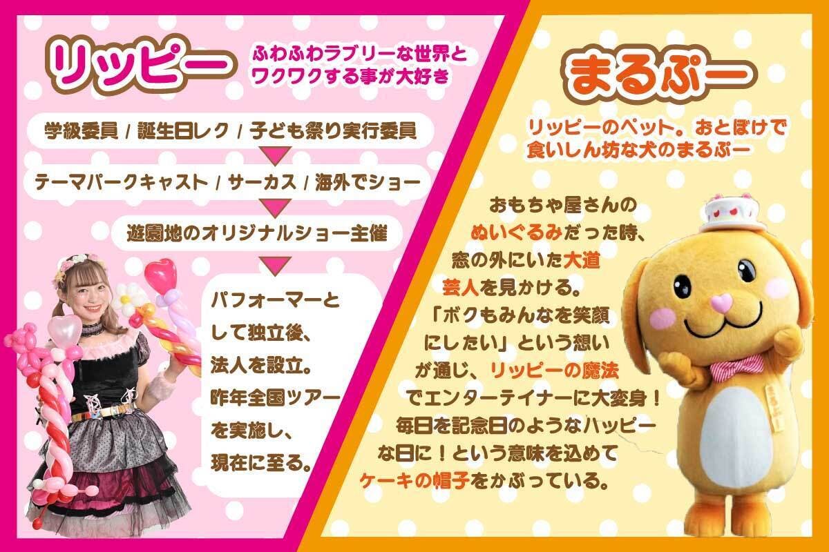 ようこそ!リッピーです! 私は「歩くテーマパーク」をコンセプトに活動するパフォーマンスユニット「リッピー&まるぷー」の一員として、日本全国に笑顔と希望を届けています。保育園、幼稚園、ショッピングモール、遊園地などで出演。バルーンやマジック、カラフル小道具、観覧車等が飛び出すコメディーステージで、ファミリー層を中心に夢と幸福感いっぱいの時間を提供しています!