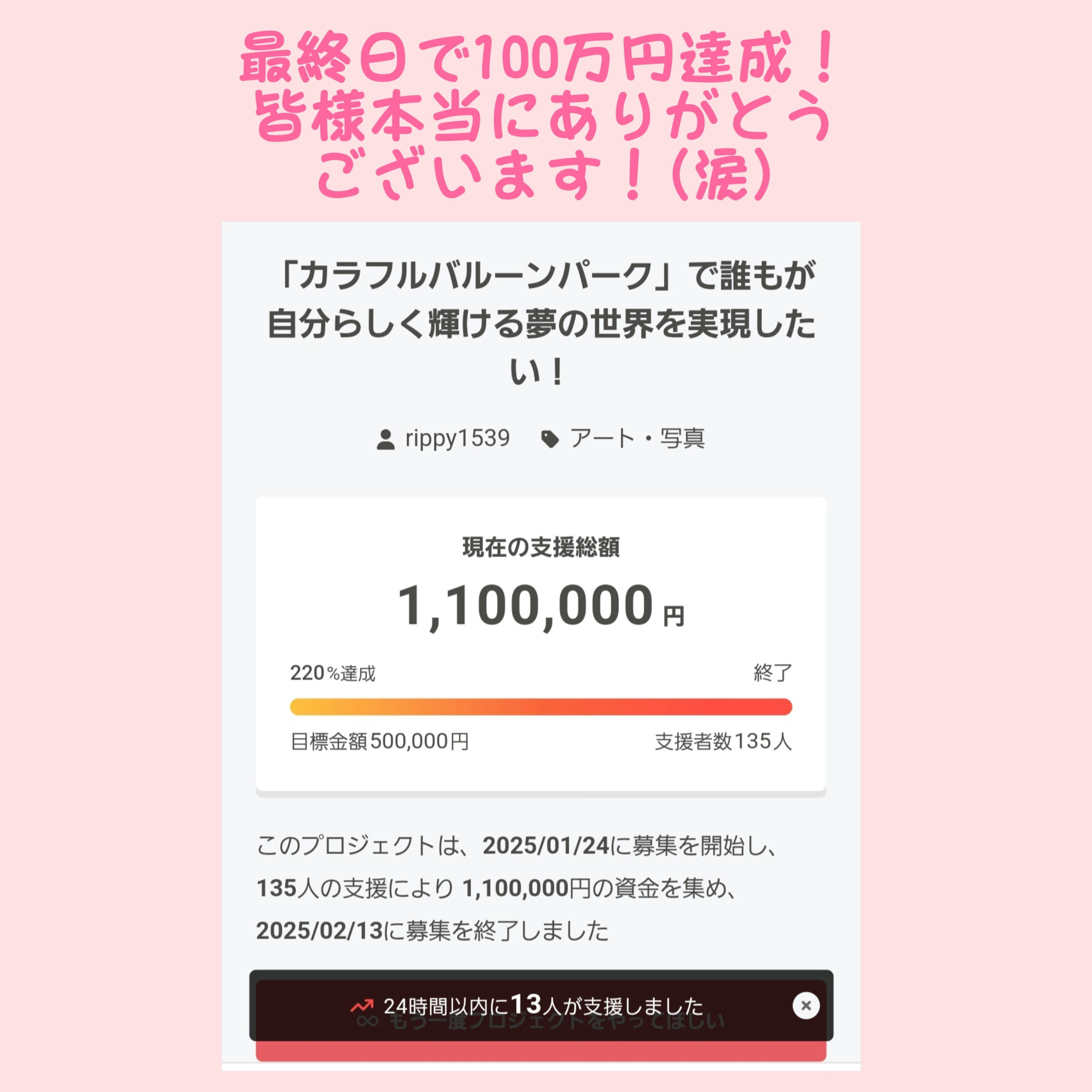 結果、支援者135名、支援総額は目標100万円を超え、110万円が集まりました!泣泣泣