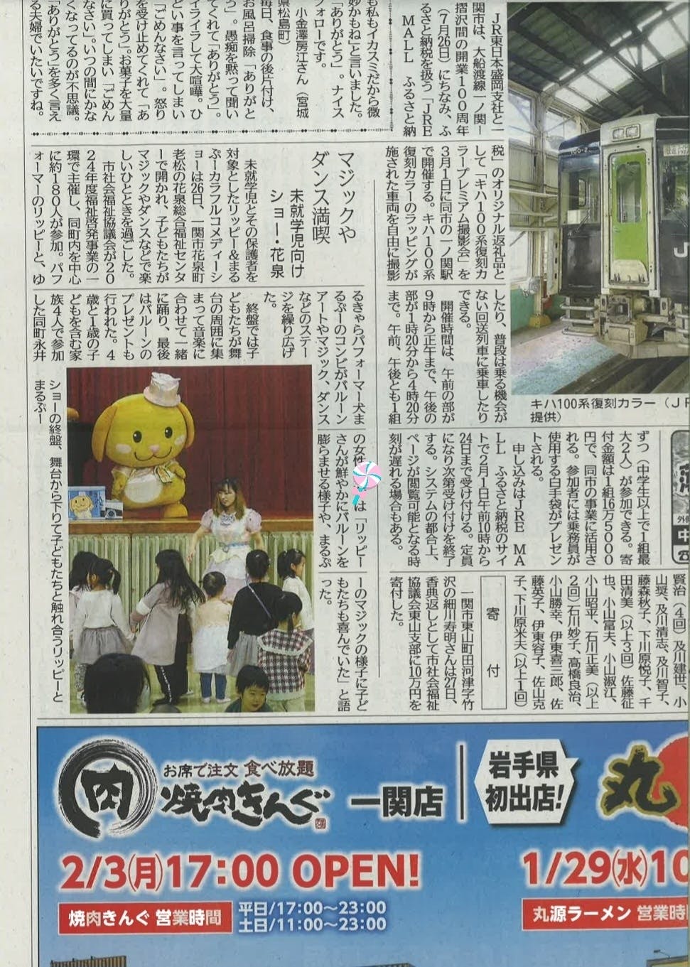 カラフルバルーンパーク 6日目のご報告(残り15日!)夜分にすみません!汗現在、支援者37名・支援額255,000円に到達しました!たくさんの方に応援いただき、心より感謝しています!泣目標達成までの道のりはまだ続きますが、引き続き皆さまのご協力をお願いいたします!先日、岩手県のイベントに出演させていただいた時の写真が新聞に載りました!!岩手のたくさんのお友だちにもカラフルバルーンパークのお話をさせていただきました!本日の注目リターン:「まるぷーが全力ハグ+ミニバルーン+会場で選べる特典」(10,000円)- まるぷーと直接ふれあえる特別な体験- その場でミニバルーンを受け取れる- 会場内の対象ブースでフード・ドリンク・サービスのいずれかを選択可能大好評につき、枠が少なくなってきていますので、まだの方はお早めに~!明日は、イベントの舞台裏についてご紹介します!