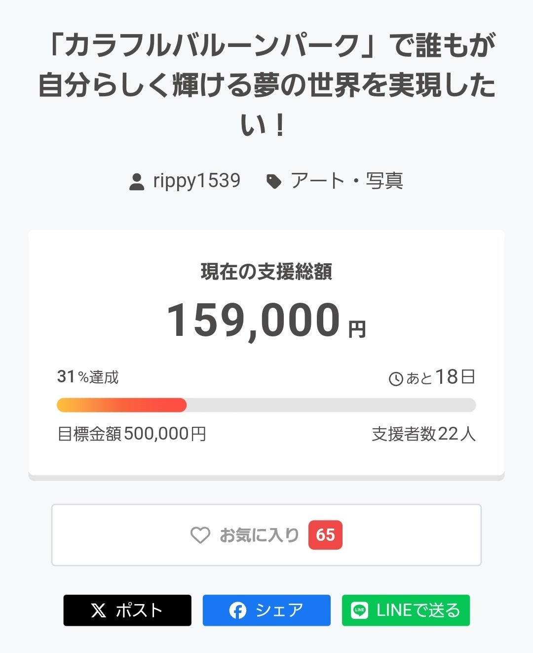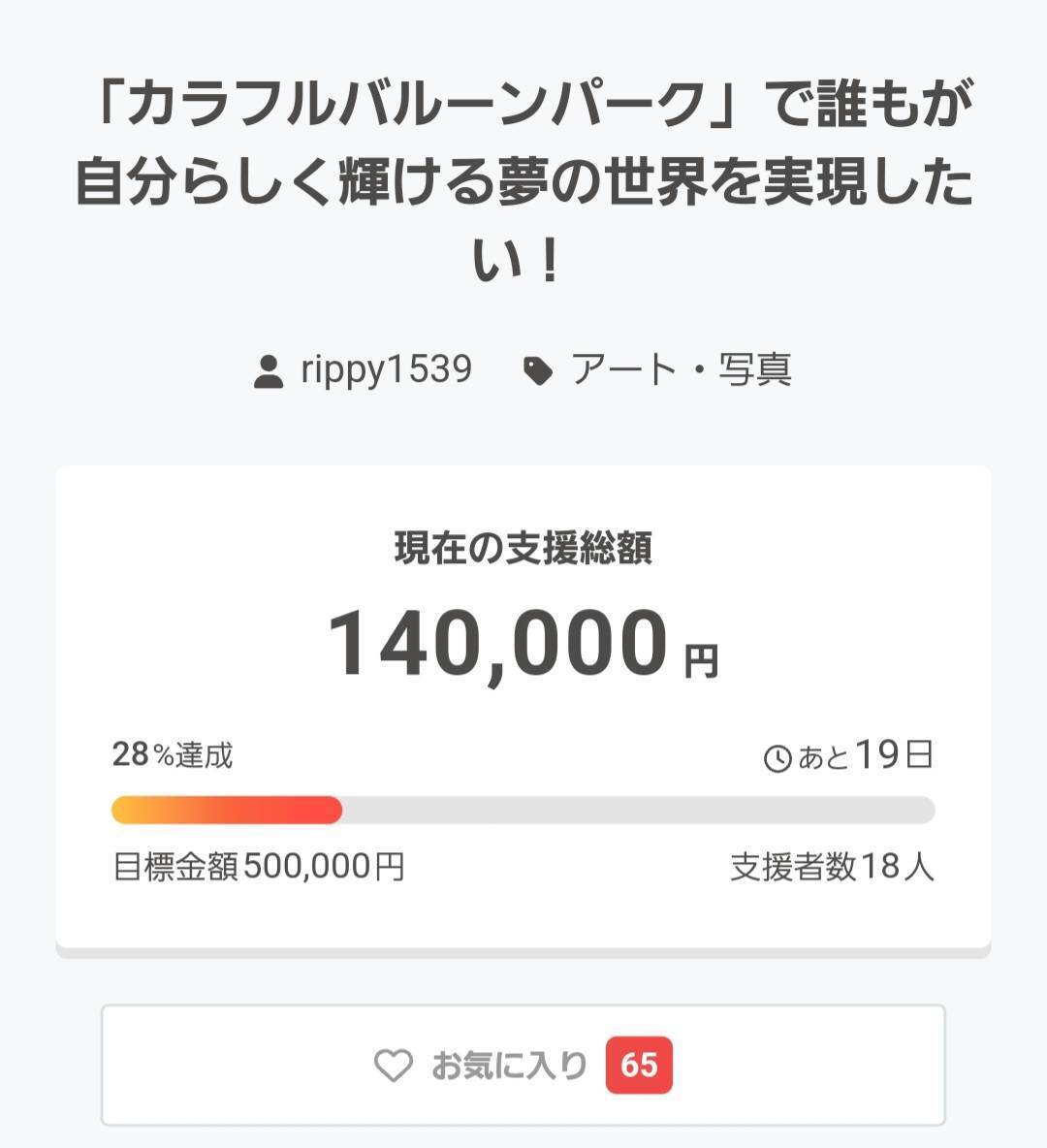 カラフルバルーンパーク 3日目のご報告CAMPFIRE「写真アート部門」デイリーランキング2位獲得! 皆さまのご支援のおかげで、カラフルバルーンパークがCAMPFIREの「写真アート部門」にてデイリーランキング2位を獲得しました!本当にありがとうございます!また、3日間で22名の方から159,000円のご支援をいただき、目標額の30%を達成しました!多くの方に共感していただけたことに、本当に心から感謝いたします。**本日の注目リターン:「まるぷーの全力ハグ+ミニバルーン+会場で選べる特典」(10,000円)** まるぷーと直接ふれあえる特別な体験・その場でミニバルーンを受け取れる・ 会場内の対象ブースでフード、ドリンク、サービスのいずれかを選択可能大好評につき、枠が少なくなってきていますので、まだの方はお申し込みはお早めに!明日は「オリジナルバルーン」のリターンについてご紹介します!