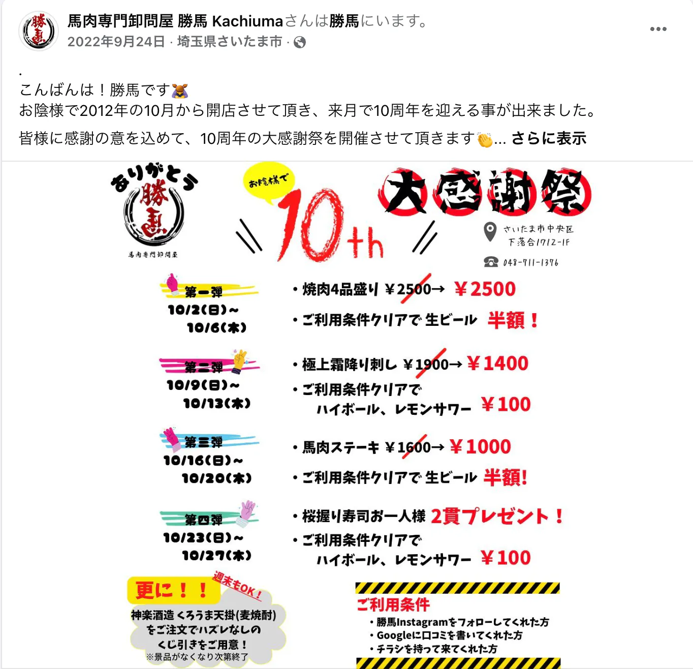 そして店舗だけでの営業に限らず、さいたま市で開催されるお祭りの日は店舗前で馬肉料理を出店したりと、地域のみなさんと共に10年という期間を歩んできました。