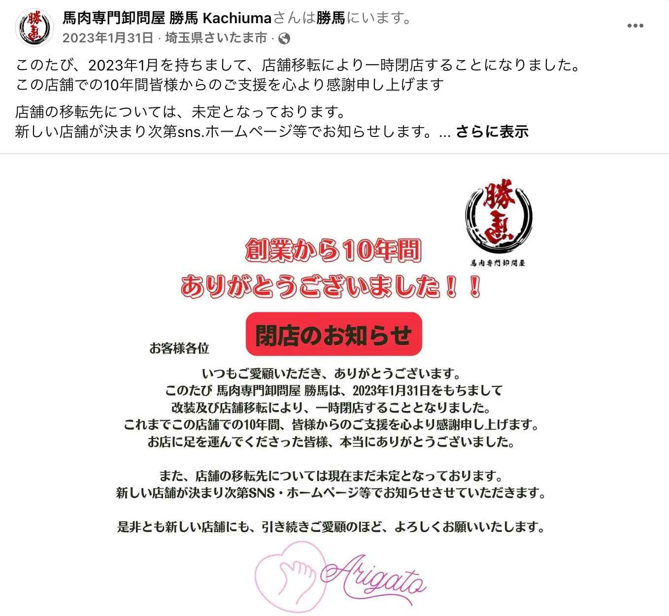私は埼玉県さいたま市で10年、「勝馬」という馬肉専門店を経営しておりました、勝田と申します。
