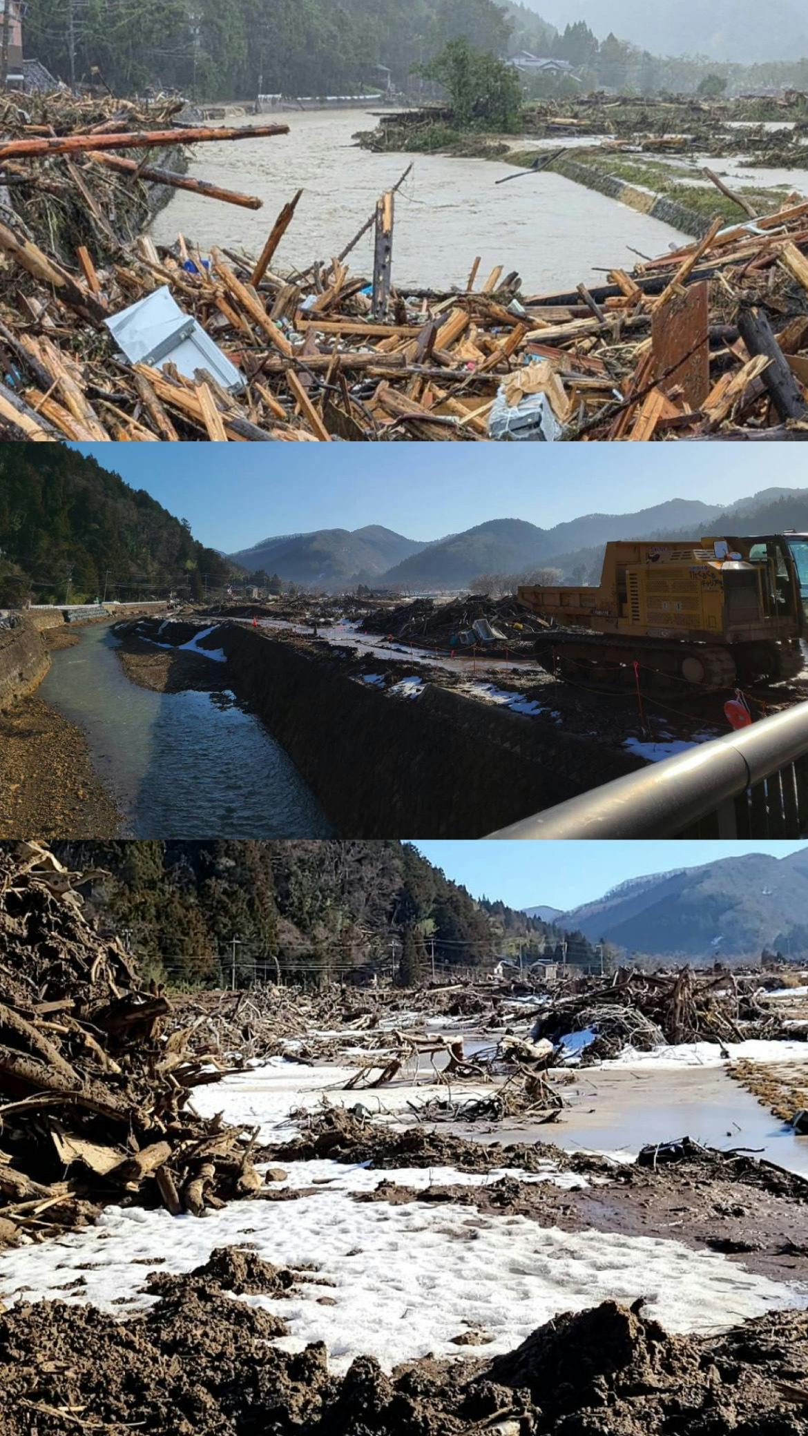 上の写真→能登半島豪雨の翌日、橋の上から撮影したものです。大量の流木が橋にかかり写真から右側、低い地の方へ水は大量に流れ込みました。そこに私たちのもう一つの田んぼはありました。真ん中の写真と水位を見比べてみて下さい。当時はこれよりさらに水位は高く、右側に見える地も水に浸る高さまで水位はありました。本来は一面、水に飲まれているような光景でした。