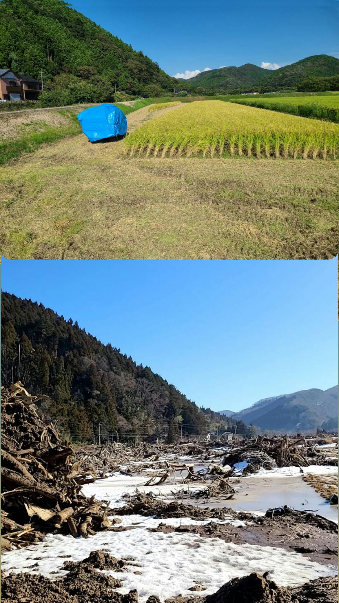 ブルーシートで覆ってあるのは数日前に回収して頂いたコンバインで、左の農道の向こうが川でした。