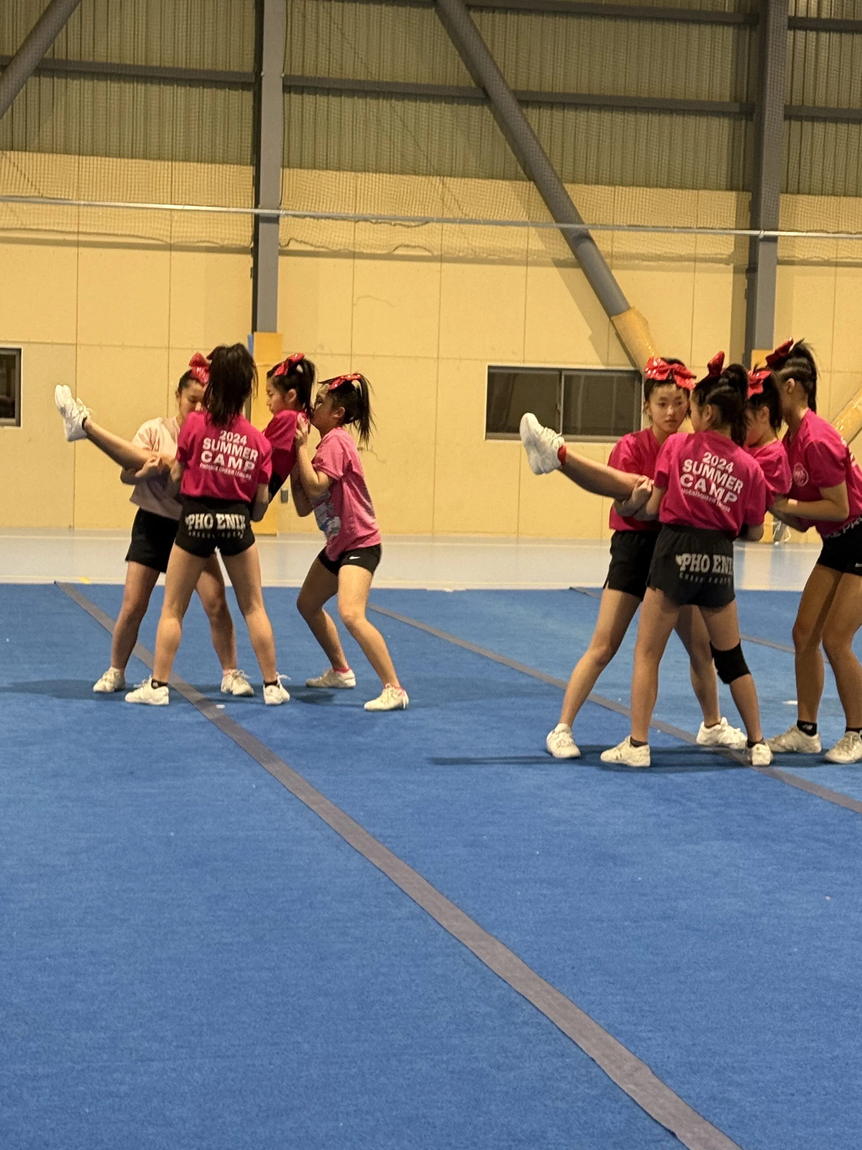 スタンツと呼ばれる組体操の上げ方・下ろし方から、トップ(上に乗る人)の手の動きや角度、位置などを丁寧に確認していきました。チアリーディングはこうした小さな積み重ねがとても大切な表現スポーツです。