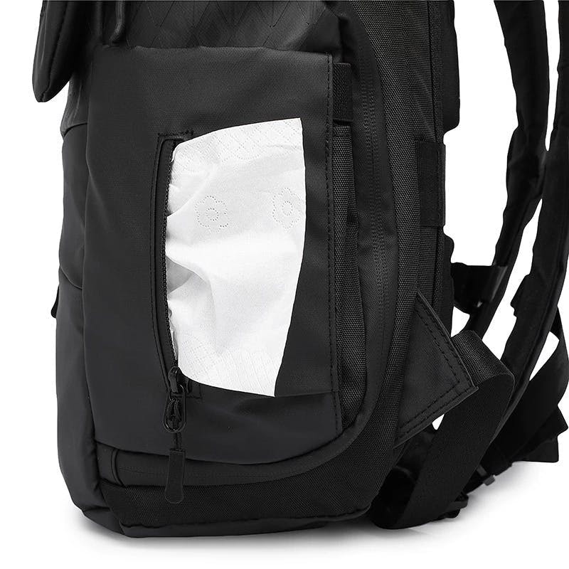 きれいに整理整頓できる両サイドポケットを加えて、ティッシュポケットもあり、セットさえすれば、背負ったままでも一枚ずづ取り出せます。内部へのスムーズなアクセスも実現し、取り出したいものがすぐに手に届きます。