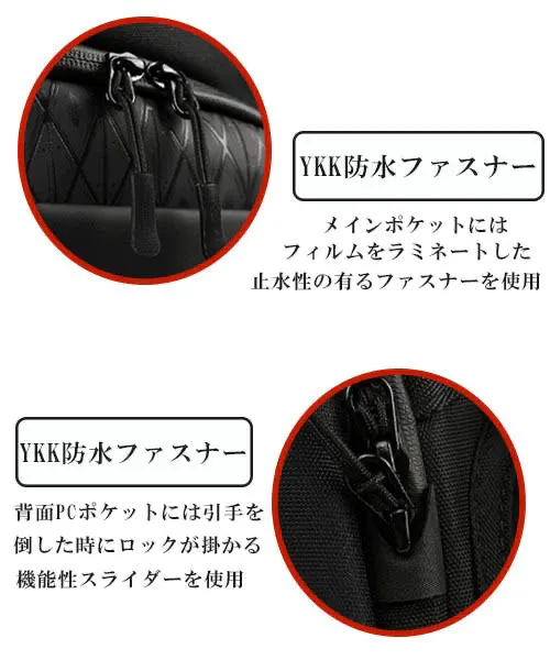 耐久性の高いYKKファスナーを採用、ファスナーからも水の侵入を防ぎます。ダブルファスナーで、開閉も快適です。水を弾く撥水素材とYKK止水ファスナーにより、突然の雨でも荷物を守ってくれます。