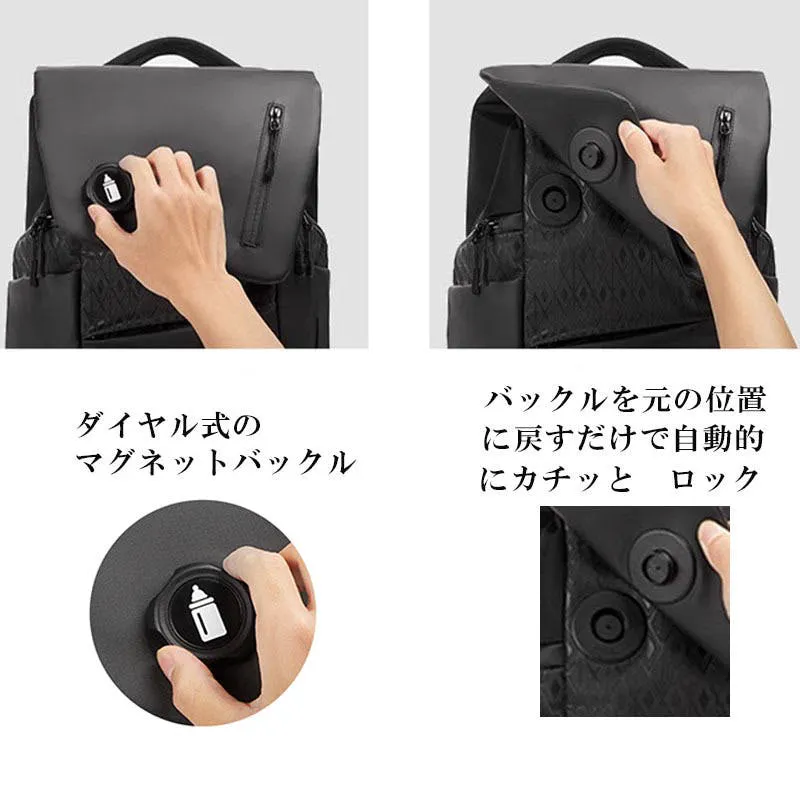 バックルはダイヤル式で、上部から開けるときは回すだけでバッグを開けます。逆に締めるときは、わざわざダイヤルを回して留める必要はなく、バックルを元の位置に戻すだけで自動的にカチッとはまるようになっています。閉め忘れにも回避できるようになります。