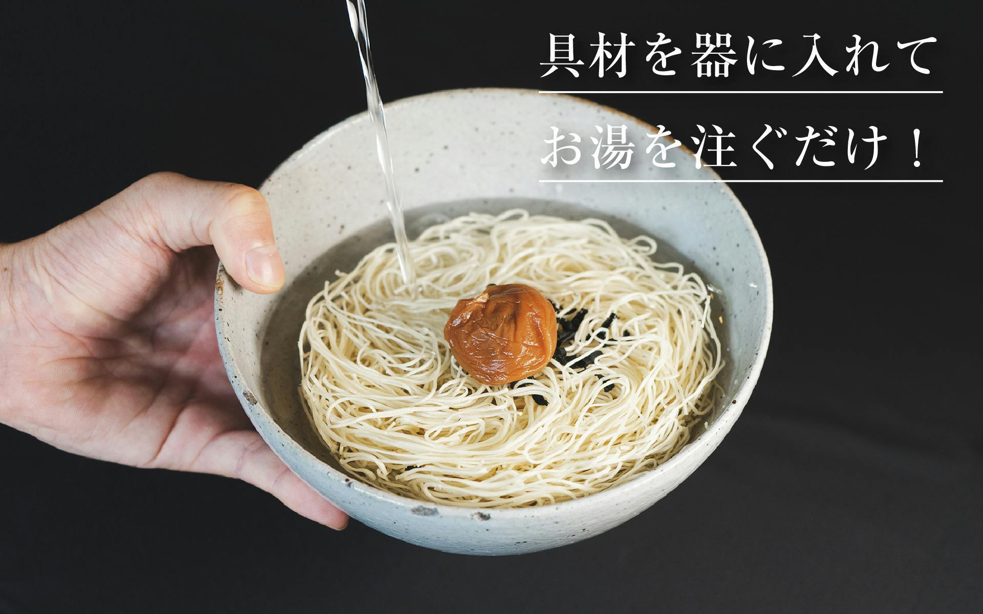 具材を器にいれて、お湯を注ぐだけ。3分待てば麺がほぐれて上質な素麺に。