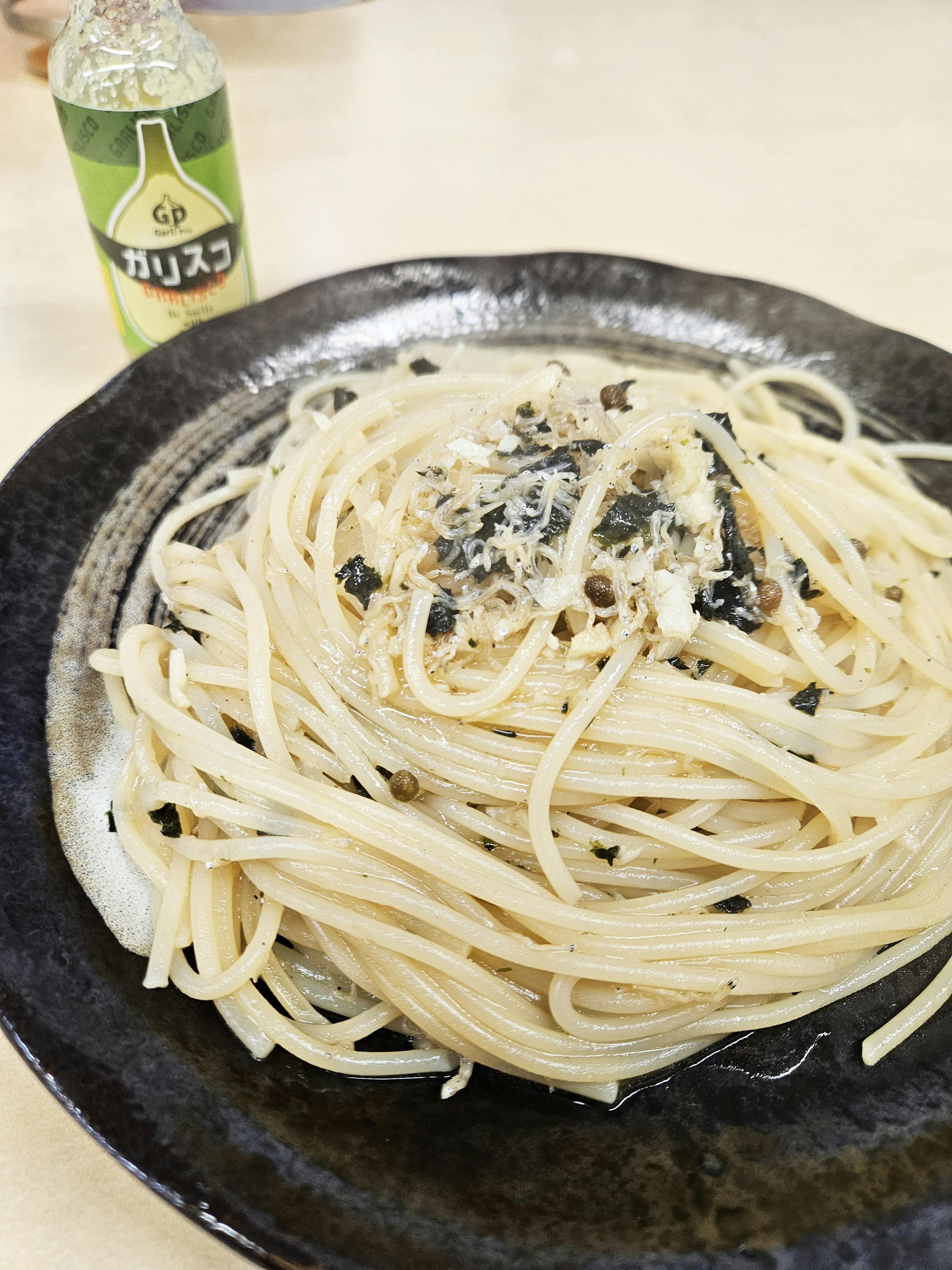 昨日は、ジャコとシソの実を使ったペペロンチーノで、さらに追いにんにくとしてガリスコをふりかけていただきます!