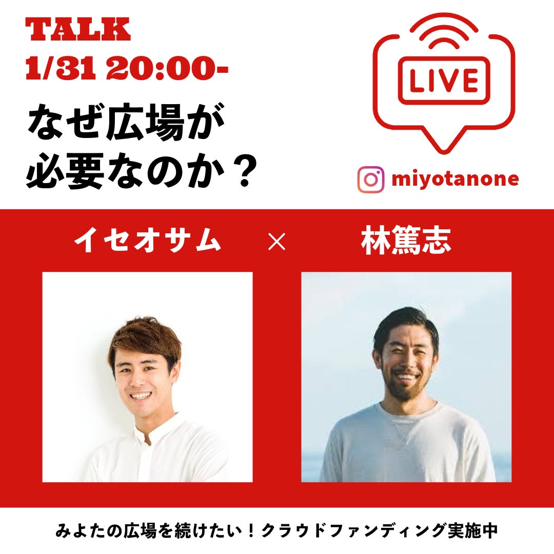 イセオサム×林篤志のトークイベント「なぜ広場が必要なのか?」を、1月31日(金)20時から、インスタライブにて開催します。みよたの広場Instagramアカウント(@miyotanone)をフォローして、当日ご覧ください。