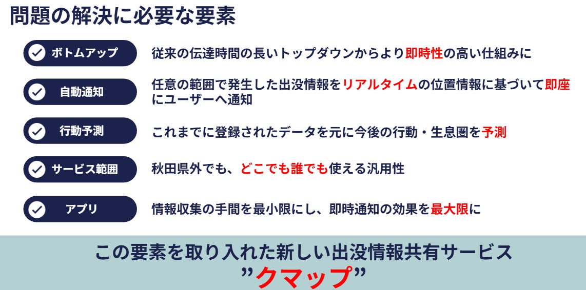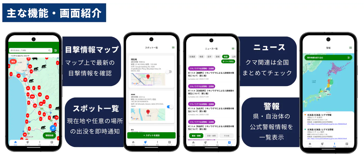 私たちのアプリは、クマの出没情報を“見える化”することで、 地域の方々が危険を予測し、行動を変える判断材料を手にできるようにするものです。