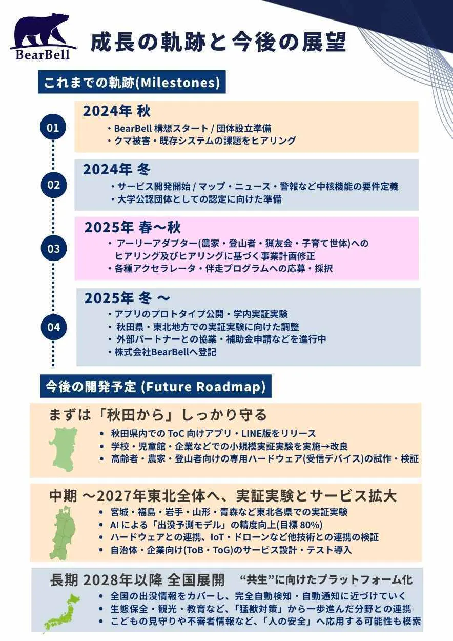 2026/01/14 19:512025年12月5日、起業家甲子園における東北地区の連携大会である「SPARK!TOHOKU 2025 Startup Pitch」にて、BearBell代表・服部が最優秀賞であるNICT賞をいただき、起業家甲子園への出場権を獲得しました!東北各地から熱い起業家が集まる中で、BearBellが掲げる「安全から共生へ」というビジョンや、クマップの社会貢献性を高く評価していただき、大変光栄です。また今回、事前に参加したNICT様主催「VC One on One Match 2025」にてメンターの方々からいただいたアドバイスが、ピッチのブラッシュアップに直結しました。ご指導いただいたみなさまへ、あらためて感謝申し上げます。2026年3月10日に東京で開催される起業家甲子園出場を目指し、さらに事業を磨き上げていきます!引き続き応援よろしくお願いします!審査結果ページはこちら: https://www.nict.go.jp/venture/2025_spark-tohoku_report.html もっと見る