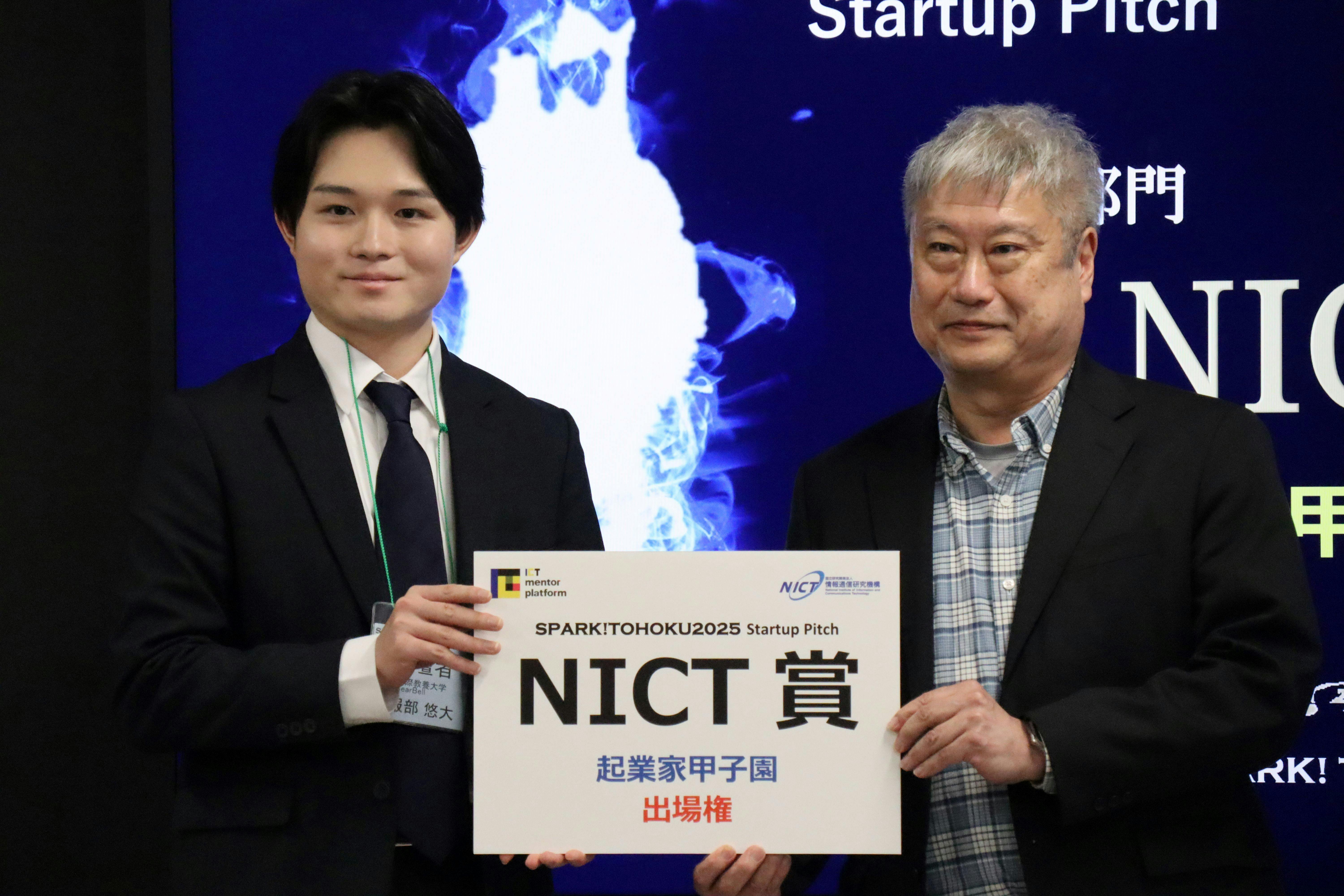 2025年12月5日、起業家甲子園における東北地区の連携大会である「SPARK!TOHOKU 2025 Startup Pitch」にて、BearBell代表・服部が最優秀賞であるNICT賞をいただき、起業家甲子園への出場権を獲得しました!