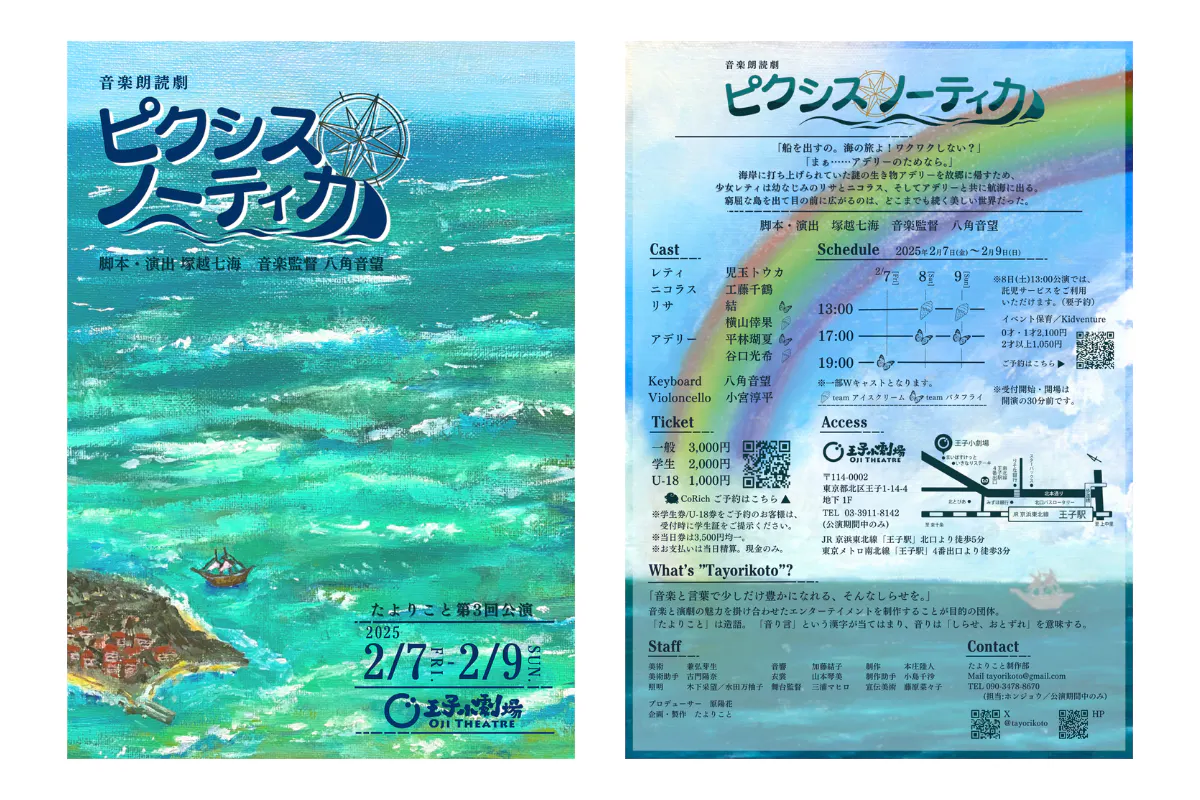2025/02/16 13:41こんにちは!たよりことです。音楽朗読劇『ピクシス・ノーティカ』が、2月9日(日)に千穐楽を迎えました!全5公演で250名を超える方にご来場いただき、ほぼすべての公演で満席をいただきました。チェロが加わった生演奏や、Wキャストでの上演。たよりこと念願の挑戦でした。公演のご感想は、ぜひ「#ピクティカ」をつけてご投稿ください!teamバタフライ 舞台写真(撮影:川村太貴)teamアイスクリーム 舞台写真(撮影:川村太貴)ご支援いただいた皆さま、足をお運びいただいた皆さま、誠にありがとうございました。キャスト・スタッフ一同より御礼申し上げます。【上演記録】たよりこと 第3回公演音楽朗読劇『ピクシス・ノーティカ』上演期間:2025年2月7日(金)~2月9日(日)上演会場:王子小劇場脚本・演出:塚越七海音楽監督:八角音望▼キャストレティ:児玉トウカニコラス:工藤千鶴リサ:結(バタフライ)、横山倖果(アイスクリーム)アデリー:平林瑚夏(バタフライ)、谷口光希(アイスクリーム)▼演奏Keyboard:八角音望Violoncello:小宮淳平▼スタッフ脚本・演出:塚越七海音楽監督:八角音望美術:兼弘芽生美術助手:古門陽奈照明:木下采望、水田万柚子音響:加藤結子衣裳:山本琴美楽曲制作協力:日野陽香舞台監督:三浦マヒロ制作助手:小島千沙制作:本庄陸人宣伝美術:藤原菜々子舞台写真:川村太貴プロデューサー:原 陽花カンパニー集合写真 もっと見る