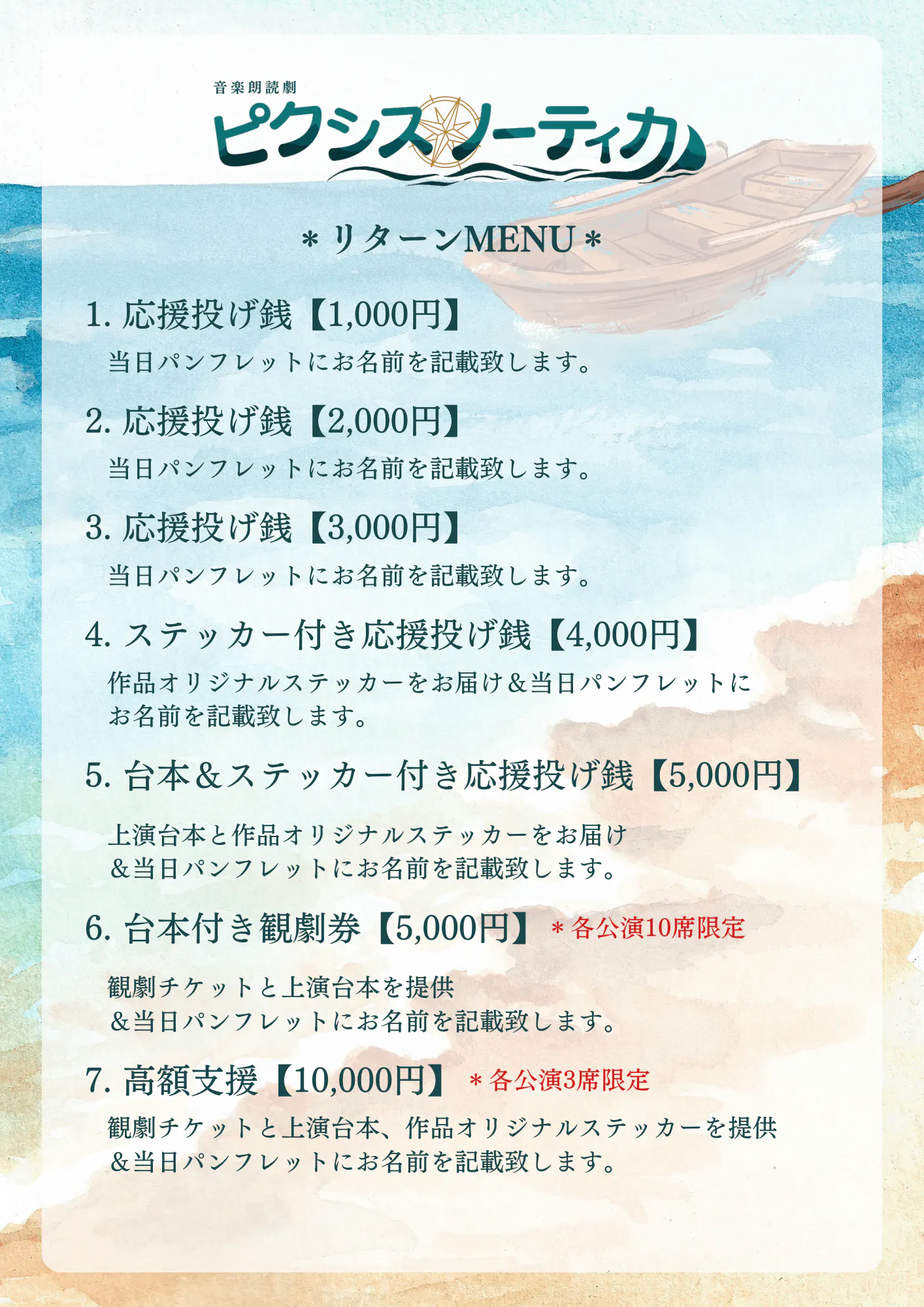 今回は、お手頃に支援いただけるプランから、観劇券付きのプラン、そしてしっかりご支援いただけるプランまで、計7つのプランを用意いたしました!