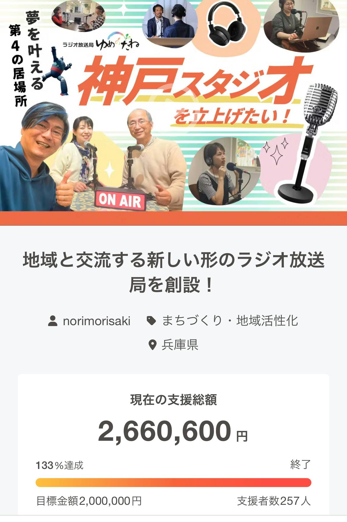 2025/02/01 14:59人生2度目のクラファン挑戦!ついに昨夜24:00に終了しました支援金2,660,600円!支援者数257人!ラストのカウントダウンLIVEではいつものメンバーやきさんに加えて、てらしゅんさんとミワさんのお二人も加わり強運なメンバー勢揃いの LIVEとなりました!そのおかげで23:59のギリギリまで支援が止まることなく続きましたさらになんと!LIVE中にゆめのたね放送局代表の岡田尚起さんと佐藤大輔さん、幹部メンバーの藤本あきよさんまで見に来てくださった LIVE中にメッセージもいただいて、嬉しかったです!とにかく、めっちゃ盛り上がりましたー!最後の最後まで感無量です最終日の支援は28名から435,000円と最高のフィナーレとなりました!本当に本当にありがとうございましたご支援だけでなく、数えきれない方々からの熱いメッセージや投稿のシェア、LIVE配信での応援などなど。みなさんのお気持ちがさらに新たな仲間を巻き込み、大きな応援の渦になったと思います必ず最高のスタジオを作ります今回のクラファンがこんなにも心地よいものとは思いませんでした応援されることで責任やプレッシャーに感じる苦しいものと思っていましたみなさんの応援がとても優しくておかげで常に前向きで自分らしくいられましたさすが、ご縁応援貢献をテーマに夢ある番組をお届けする『ゆめのたね放送局』ですこれからも自分らしく突き進んでいきます!神戸スタジオの公式LINEを作りました!神戸スタジオ開局に向けてのラジオパーソナリティ募集の案内やスタジオで開催されるイベント案内など、定期的にお知らせが届きます。ぜひご登録ください。神戸スタジオ公式LINE登録はこちらをクリック!よろしくお願いします! もっと見る